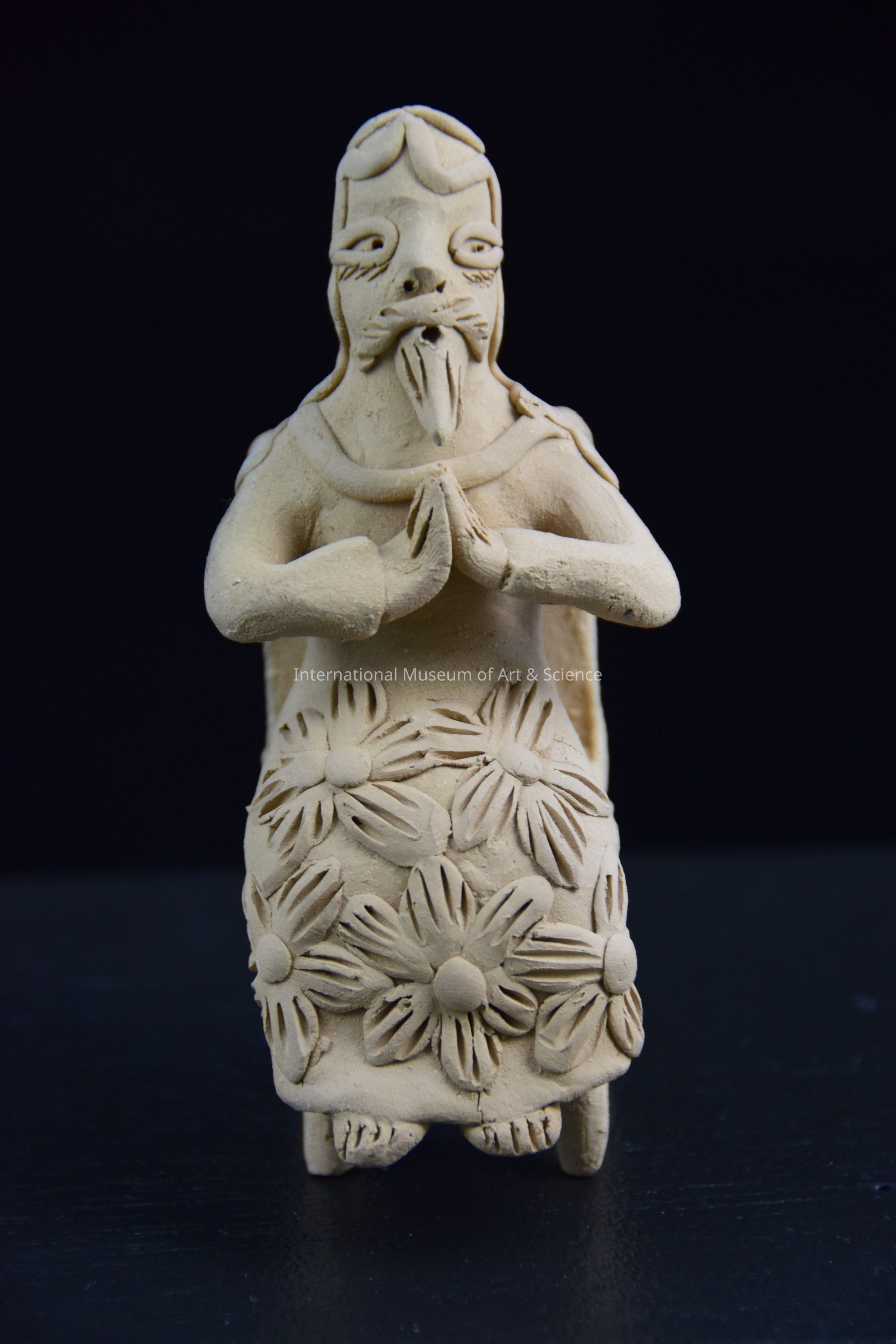 A ceramic figurine of a man sitting in a chair. He has flower detailing on his outfit. He is holding his hands together in a religious/reverent manner. He has a beard and moustache. He is one of the disciples from a Last Supper Scene.Dimensions