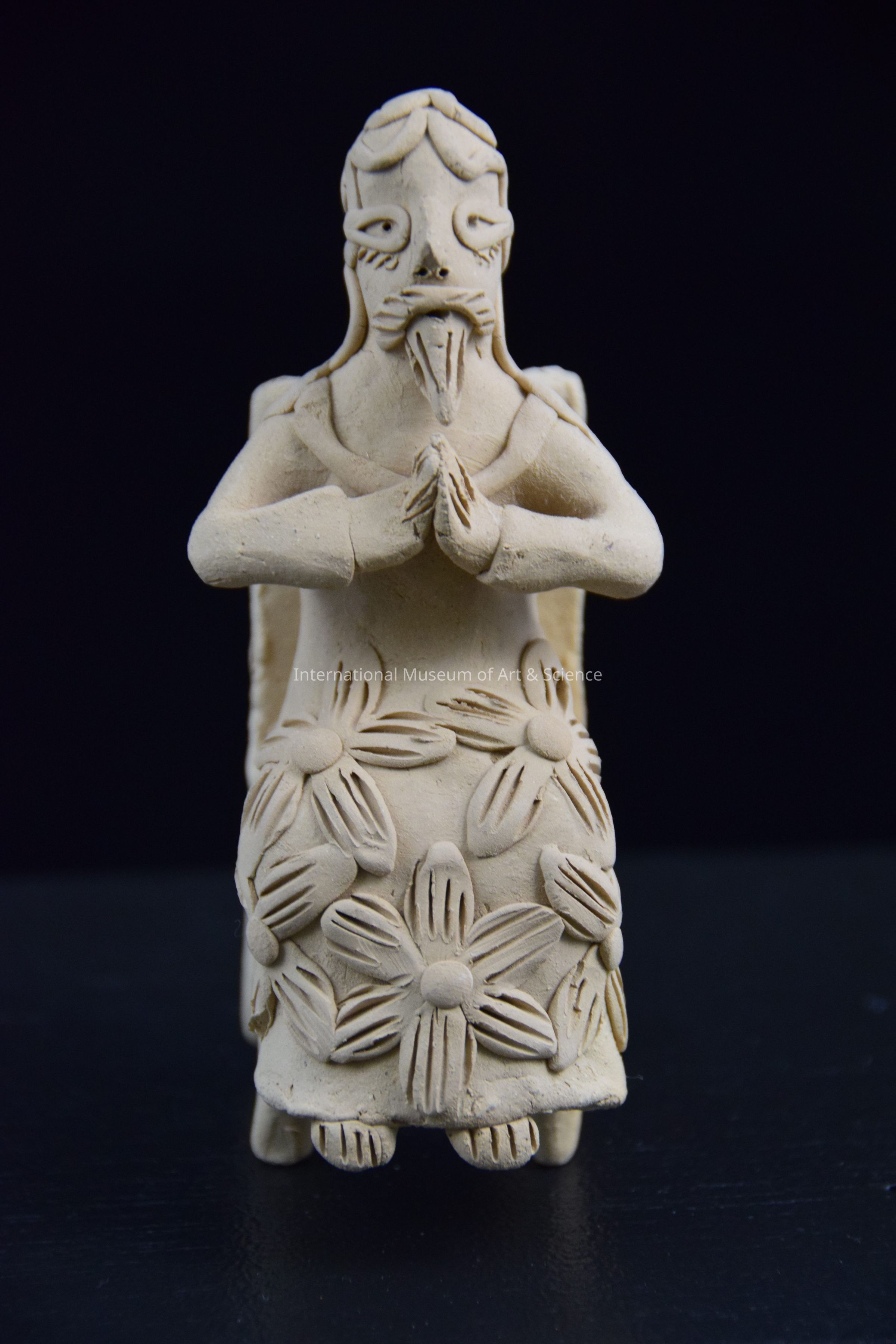 A ceramic figurine of a man sitting in a chair. He has flower detailing on his outfit. He is holding his hands together in a religious/reverent manner. He has a beard and moustache. He is one of the disciples from a Last Supper Scene.Dimensions