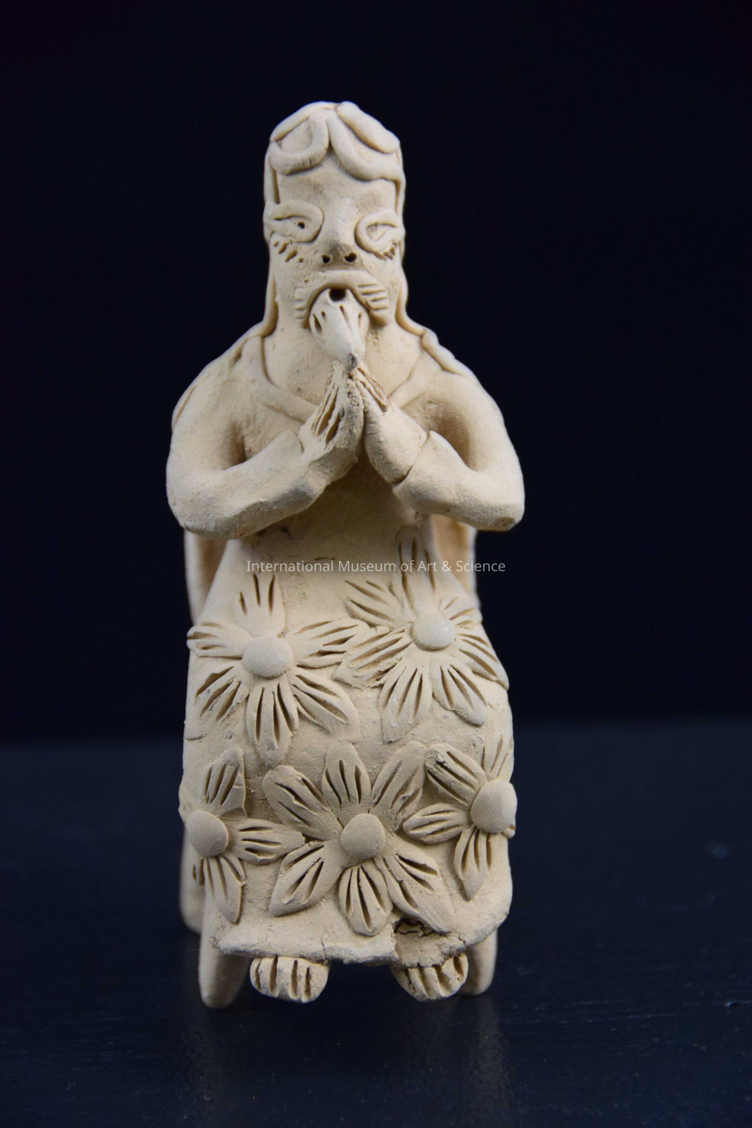 A ceramic figurine of a man sitting in a chair. He has flower detailing on his outfit. He is holding his hands together in a religious/reverent manner. He has a beard and moustache. He is one of the disciples from a Last Supper Scene.Dimensions