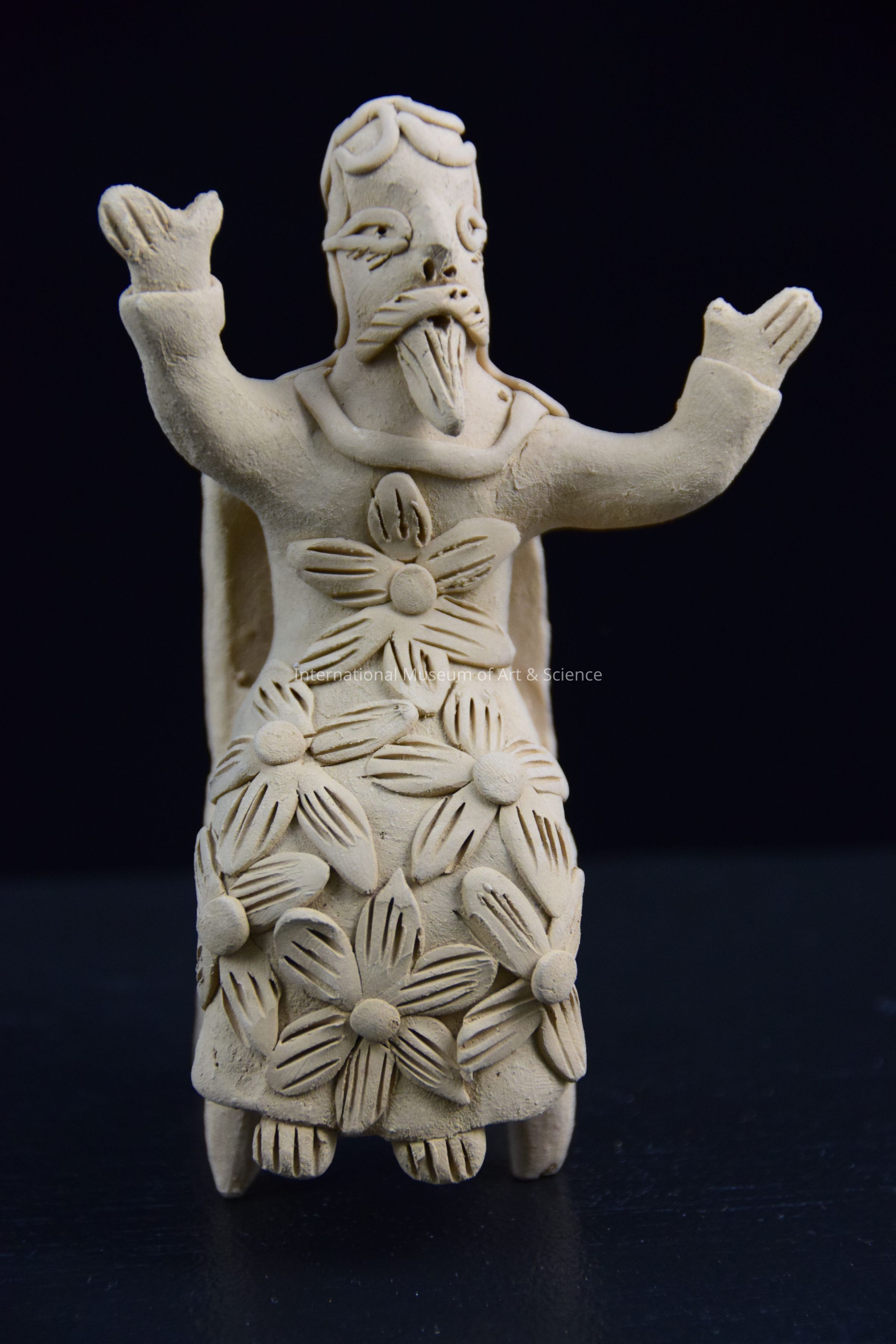 A ceramic figurine of Christ with arms upraised, sitting in a chair. He has flower detailing on his outfit. He has a beard and moustache. He is from a Last Supper Scene.Dimensions