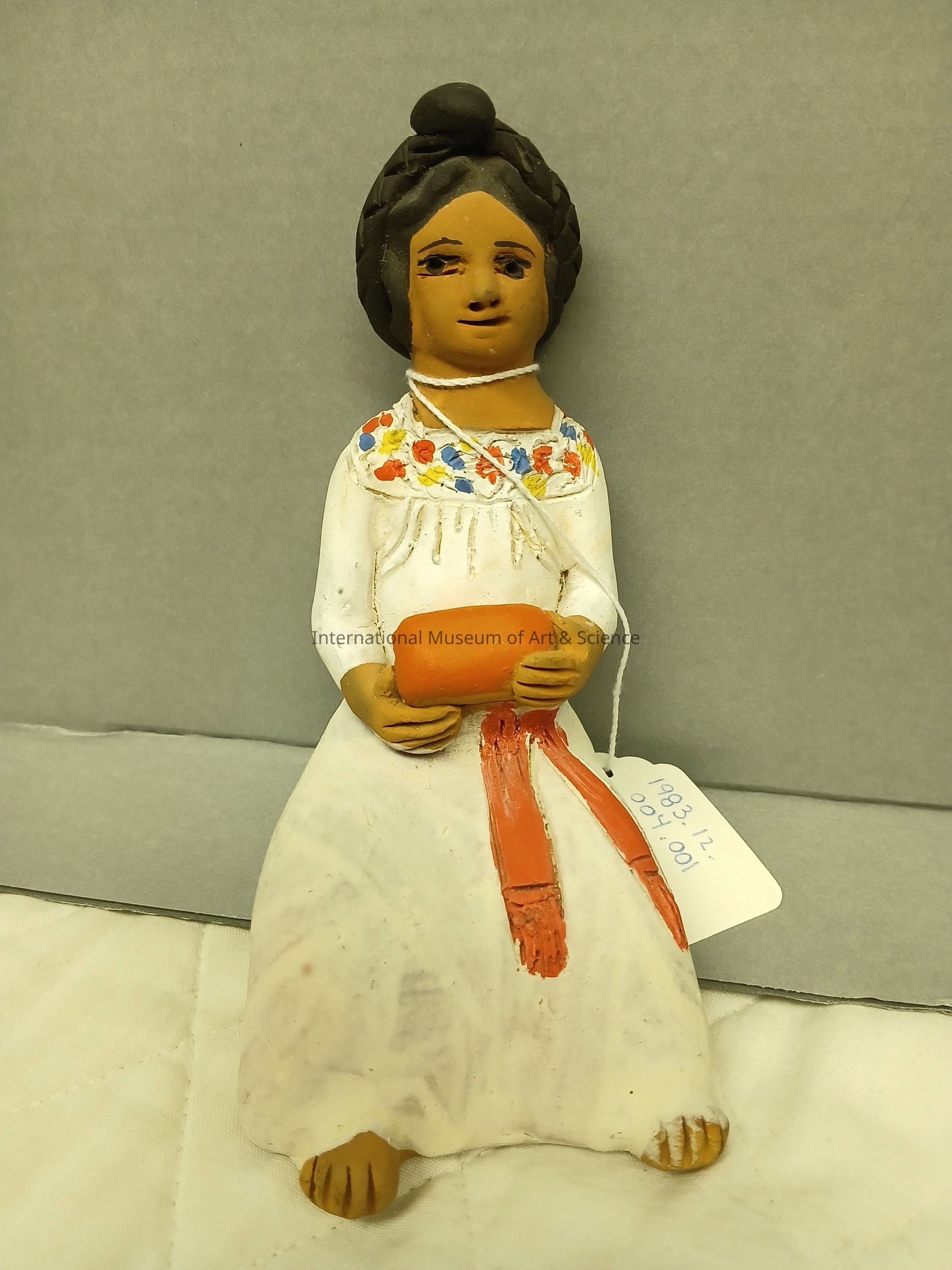 A figurine of a woman wearing a white dress with colorful spots on chest and a red belt. She is sitting down holding a red block. This figurine is from a large grouping of figures "Wedding party and cart."