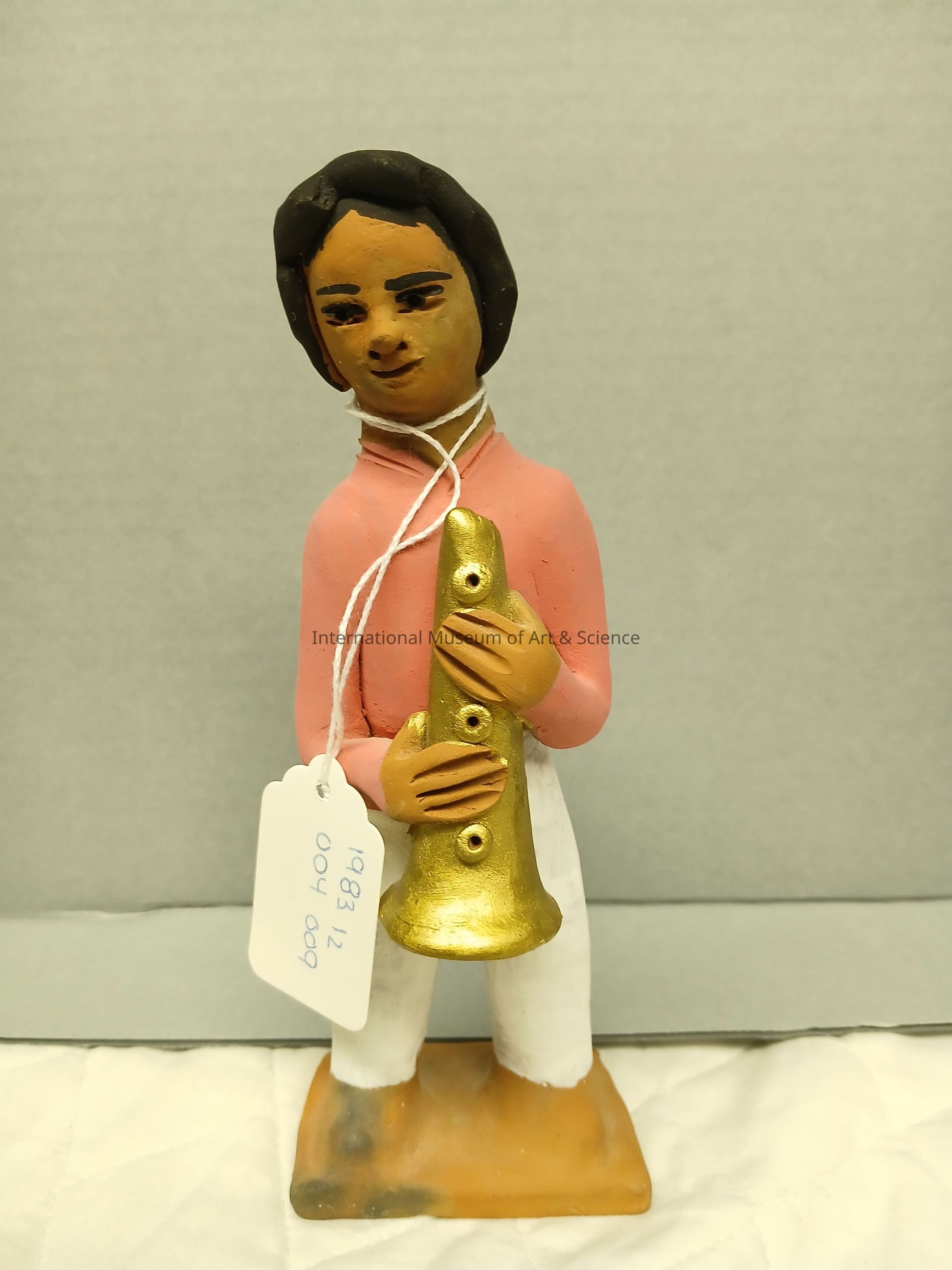 A figurine of a man with horn, wearing white trousers and a pink shirt. This figurine is from a large grouping of figures "Wedding party and cart."Artwork Details