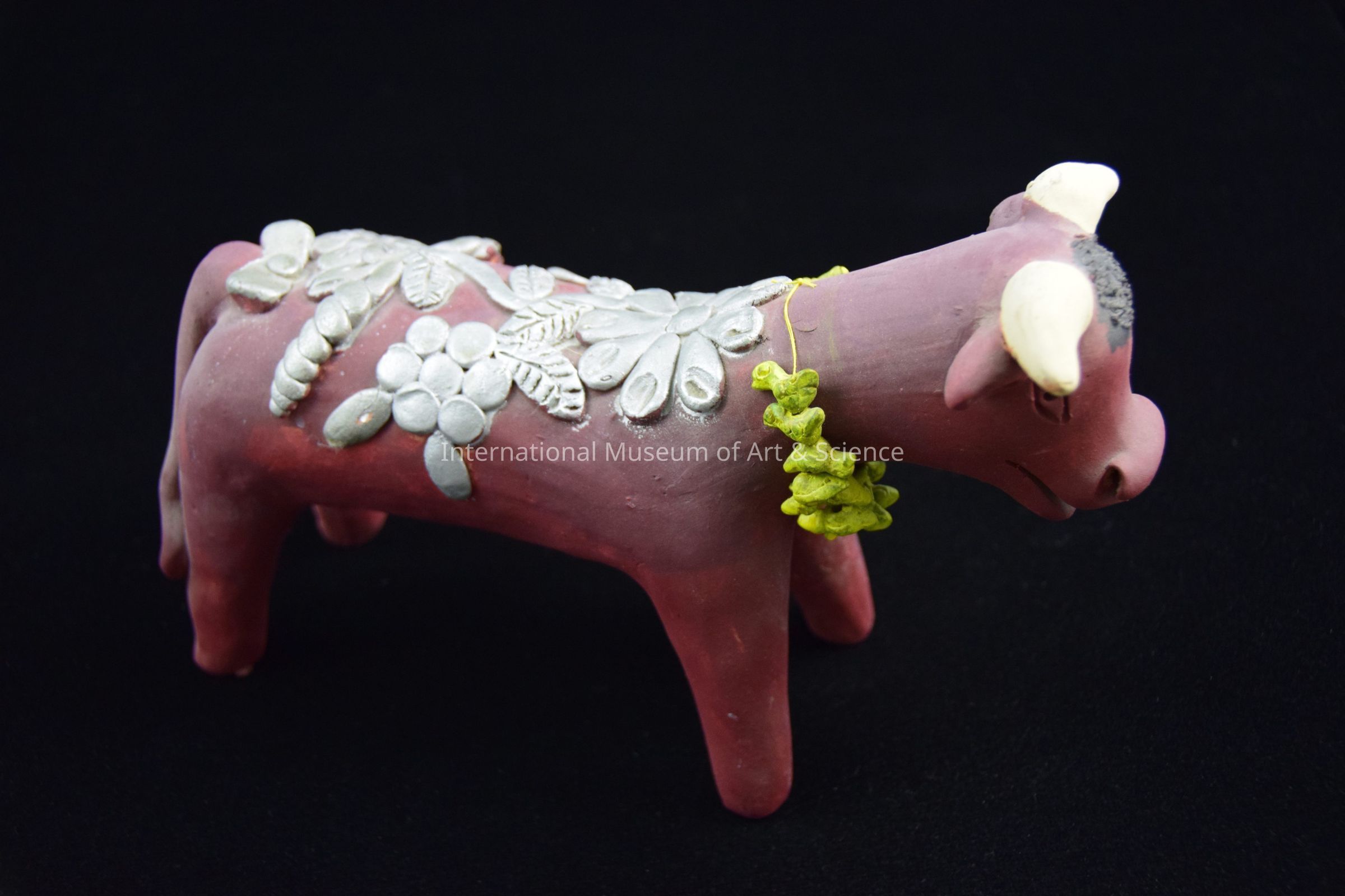 A ceramic figurine of a bull. The bull is maroon in color with silver flowers applied to its back. It wears a yellow necklace of bird beads which is attched with string to its neck. The bull is one of two that lead the car. It is part of a Wedding party and cart scene.Dimensions