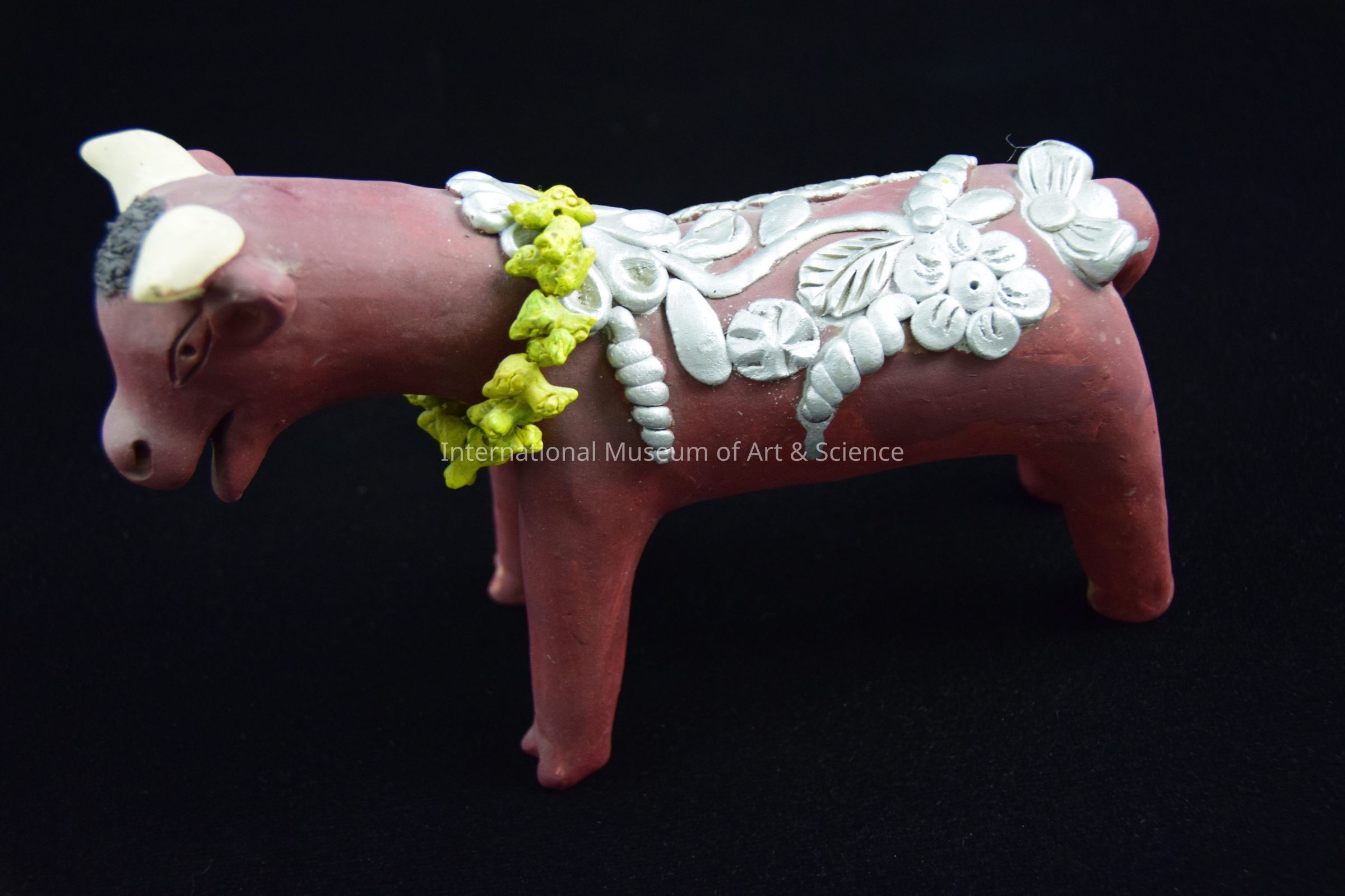 A ceramic figurine of a bull. The bull is maroon in color with silver flowers applied to its back. It wears a yellow necklace of bird beads which is attched with string to its neck. The bull is one of two that lead the car. It is part of a Wedding party and cart scene.Dimensions