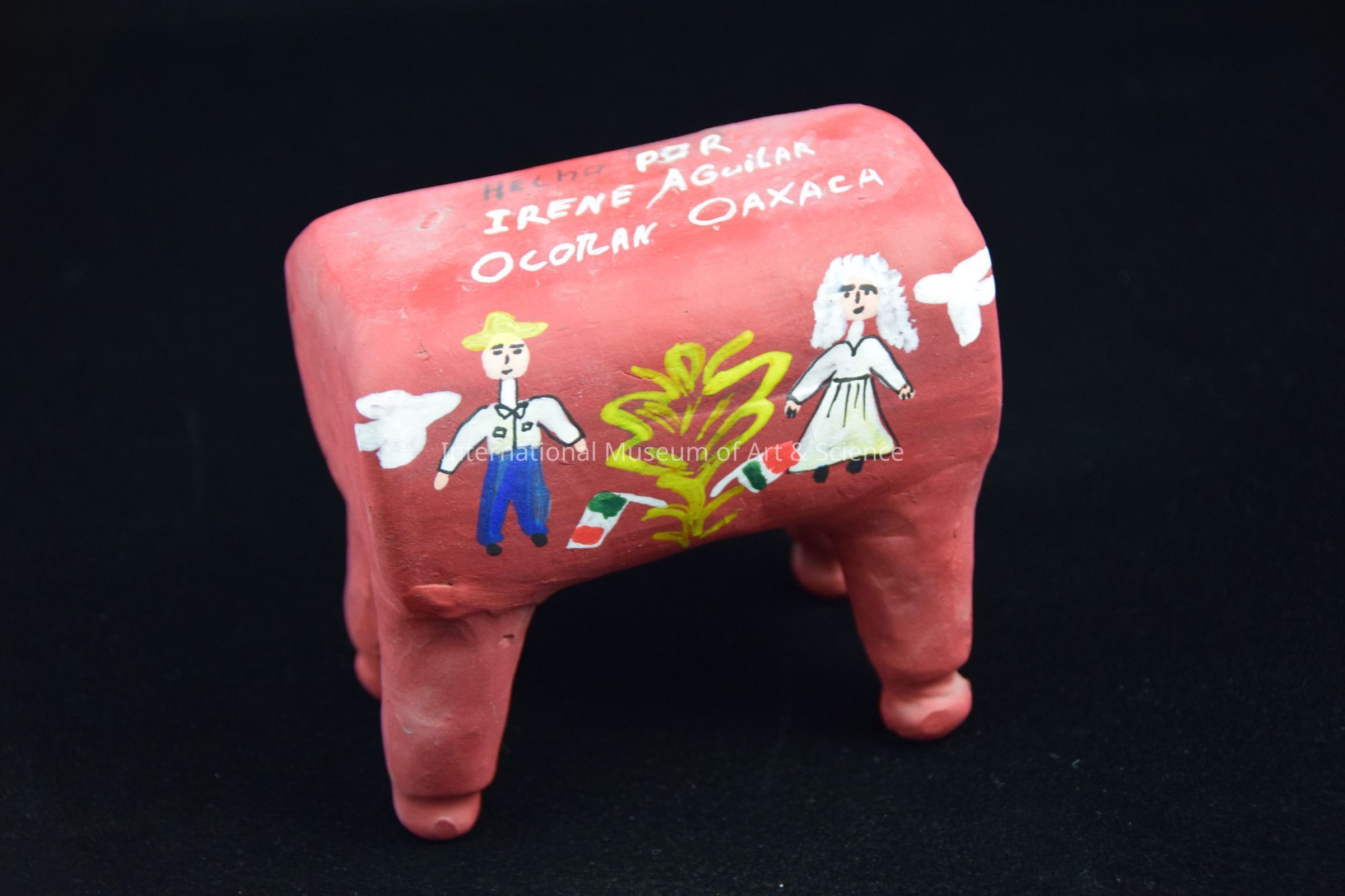 A ceramic bench. it is decoreated for a wedding with depictions of the bride and groom on the side. On the top is the artist's name and location. It is part of a Wedding party and cart scene.Dimensions