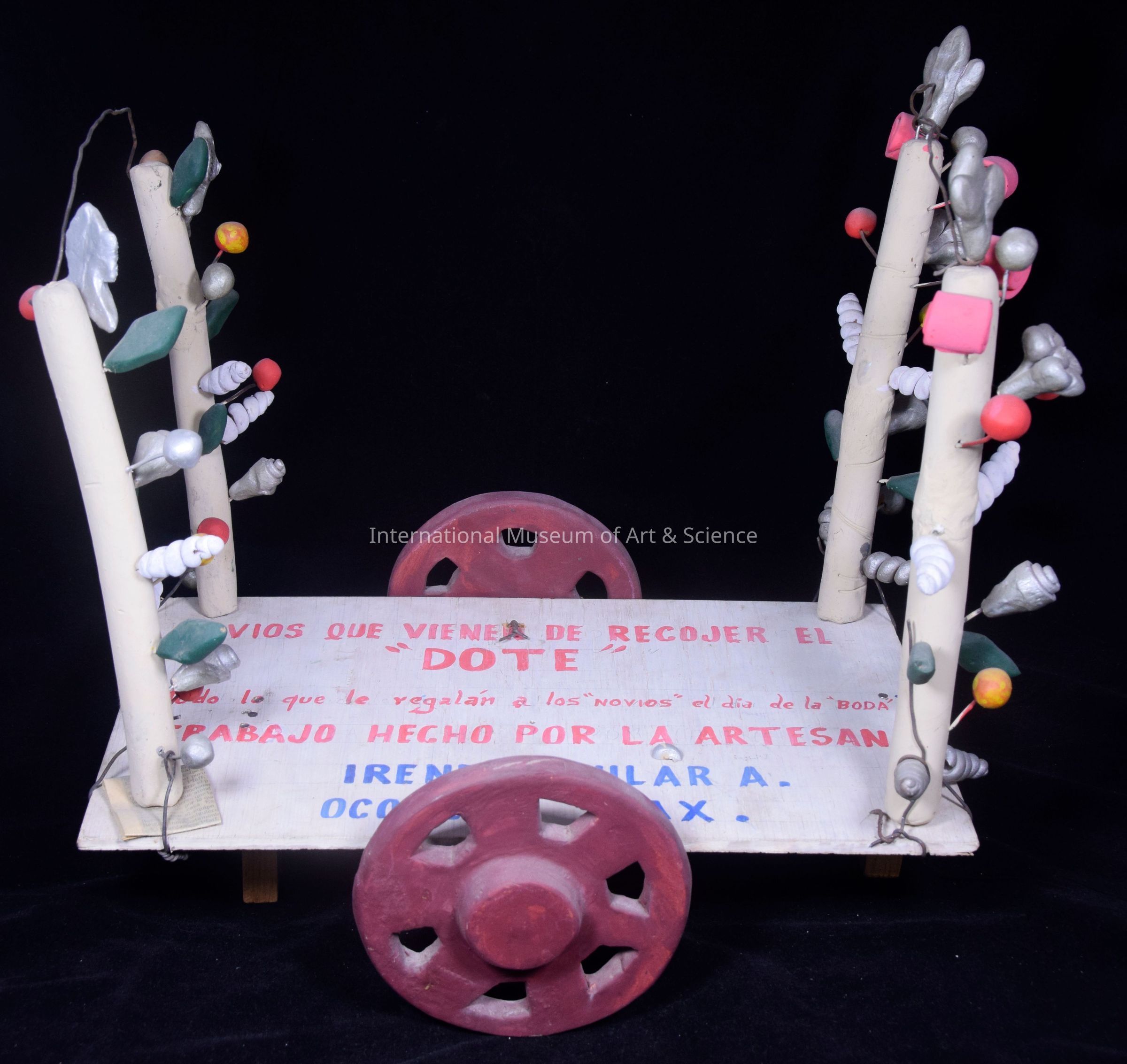 A cart from a ceramic wedding scene. There is a wooden platofrm with two clay wheels wired on, along with four clay posts, one at each corner, decorated with clay flowers and leaves.Artwork Details