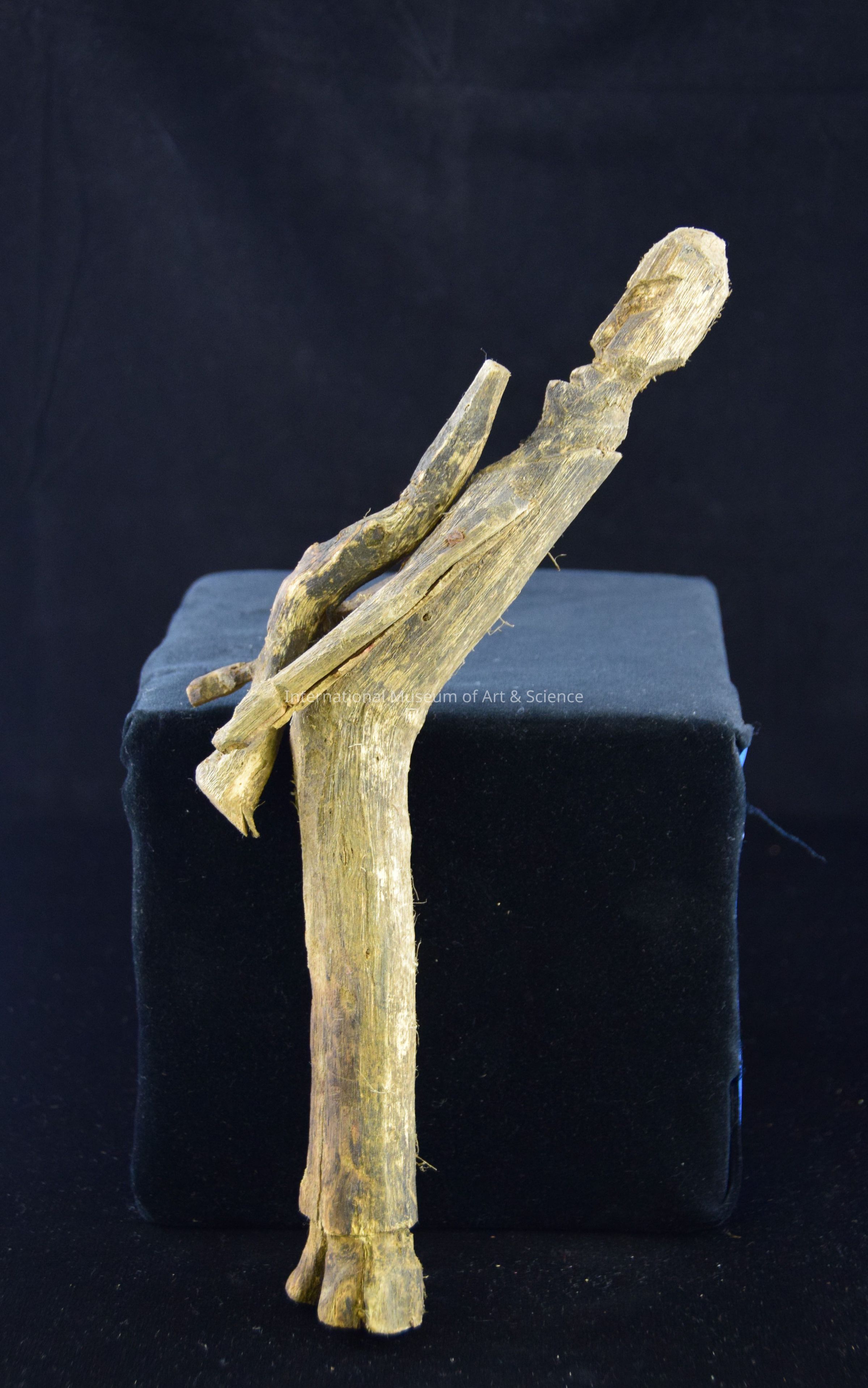 A wood carved figurine of a musician. The piece is carved with the shape of the wood in mind. The musician is leaning back because that is the natural shape of the wood. The piece is crudely carved . The arms have been attached with nails. The instrument, is a long piece of wood attached to the front of the piece. The piece is natural and unfinished.