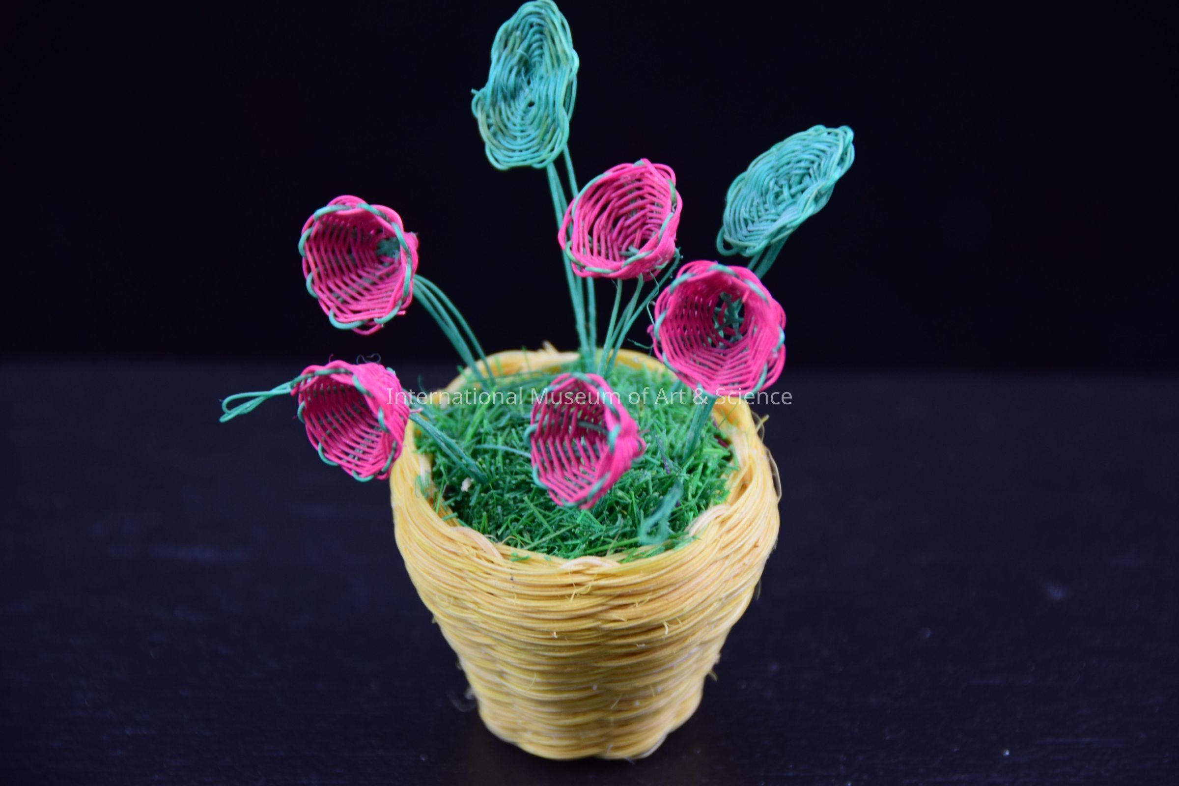 A miniature flower pot with flowers, woven out of ixtle. The pot has been woven out if ixtle that has been dyed yellow. Inside the pot are flowers and leaves dyed green and pink.