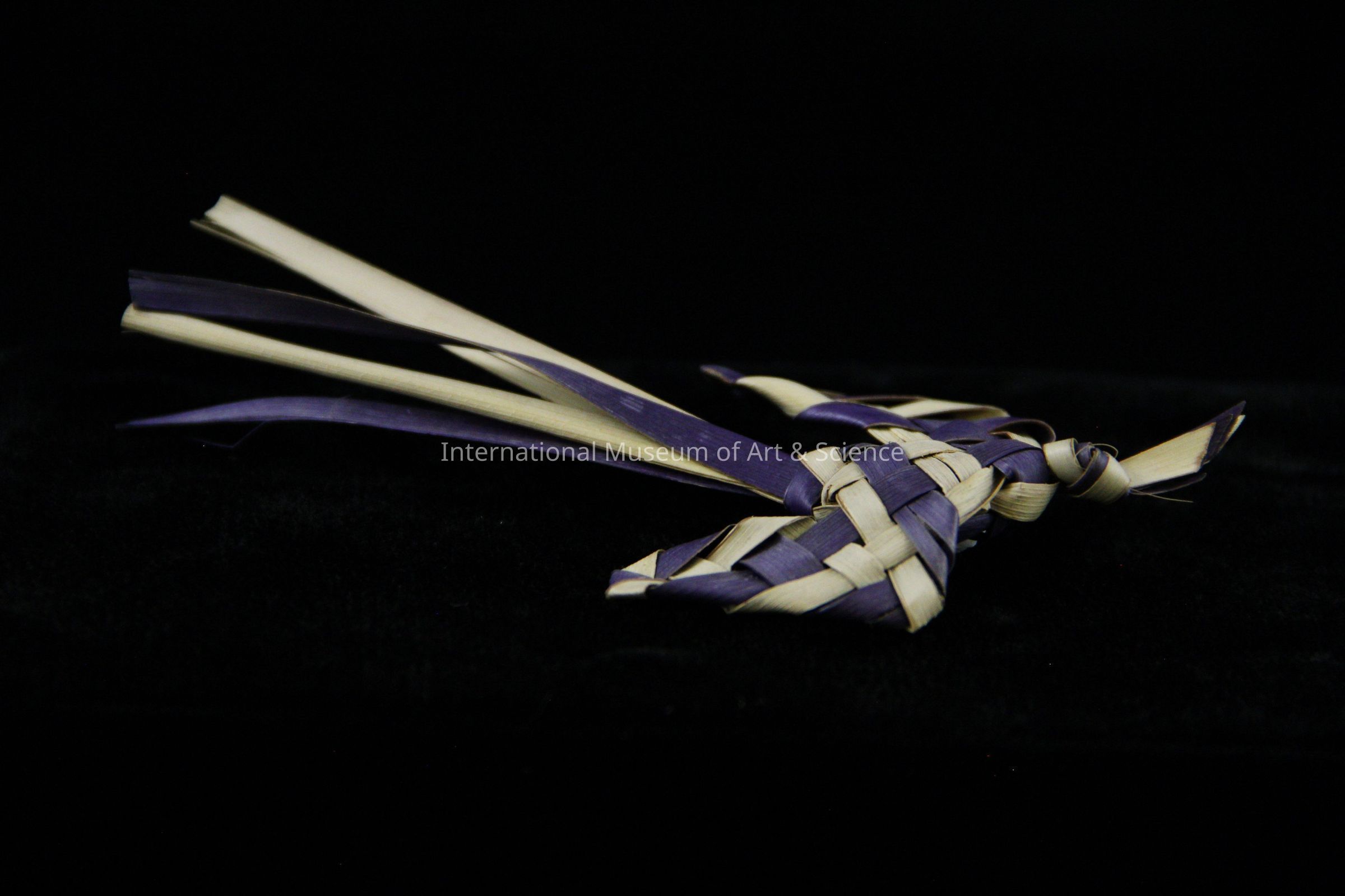 A small woven bird figurine. The bird is woven from strips of palm leaves. Some of the palm leaves have been dyed purple.Dimensions