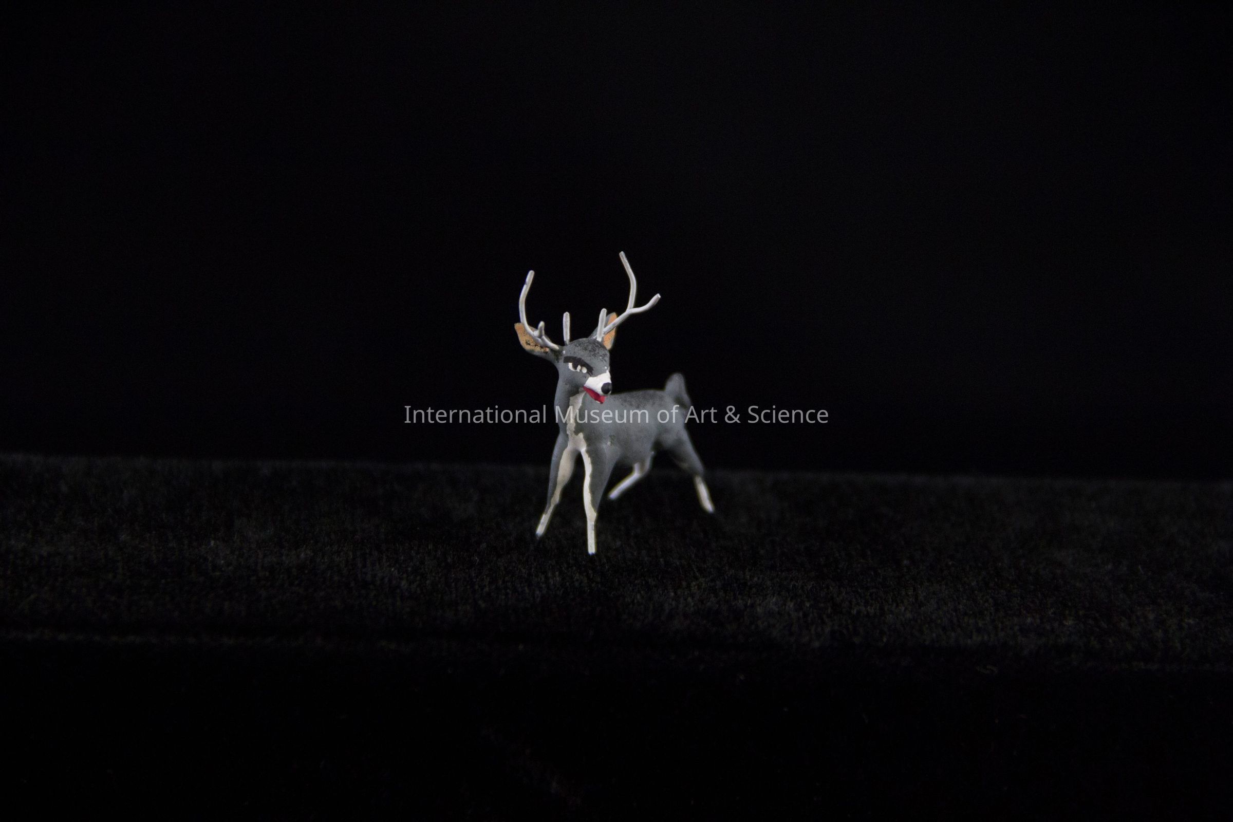 Miniature Deer with antlers. Finely detailed clay antlers painted white; black/white eyes; mouth painted red; nose black; deer partially painted dark grey with white underneath; small tail upward; inner ears rusty color; wired feet.Dimensions