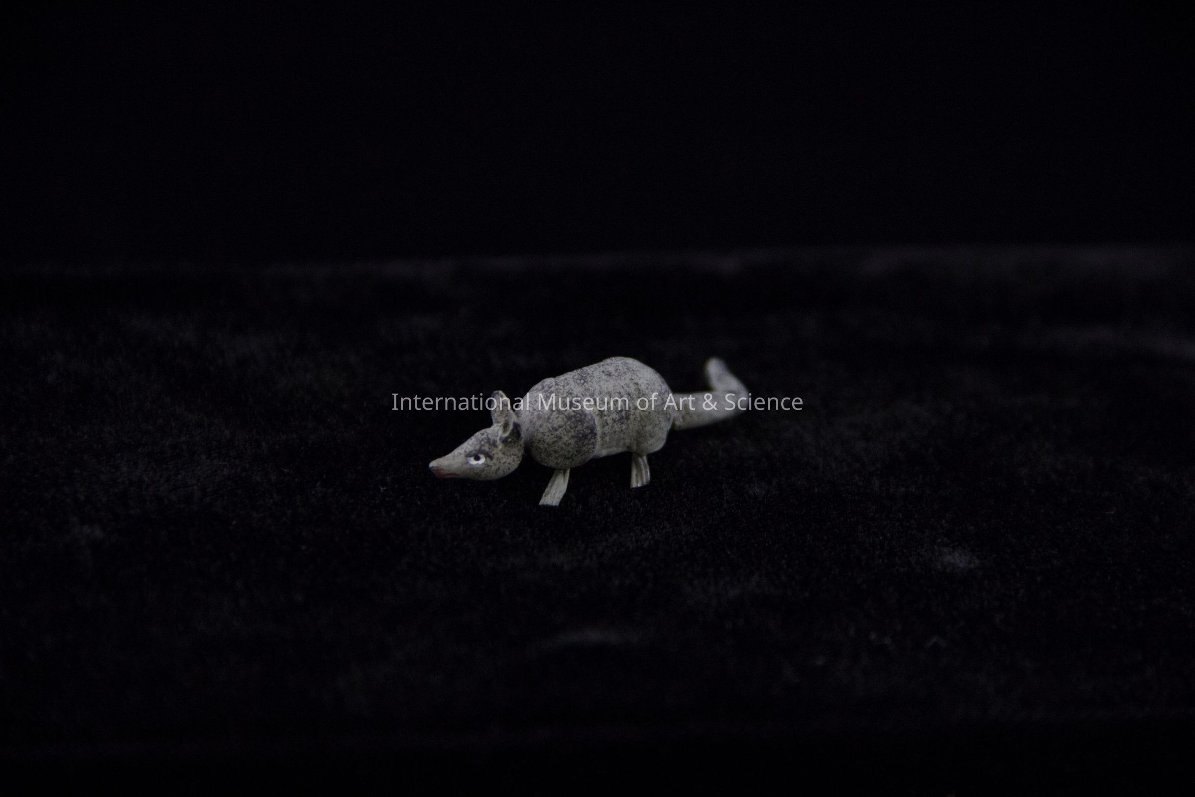 A miniature figurine of an armadillo. The finely detailed piece is painted black and grey.