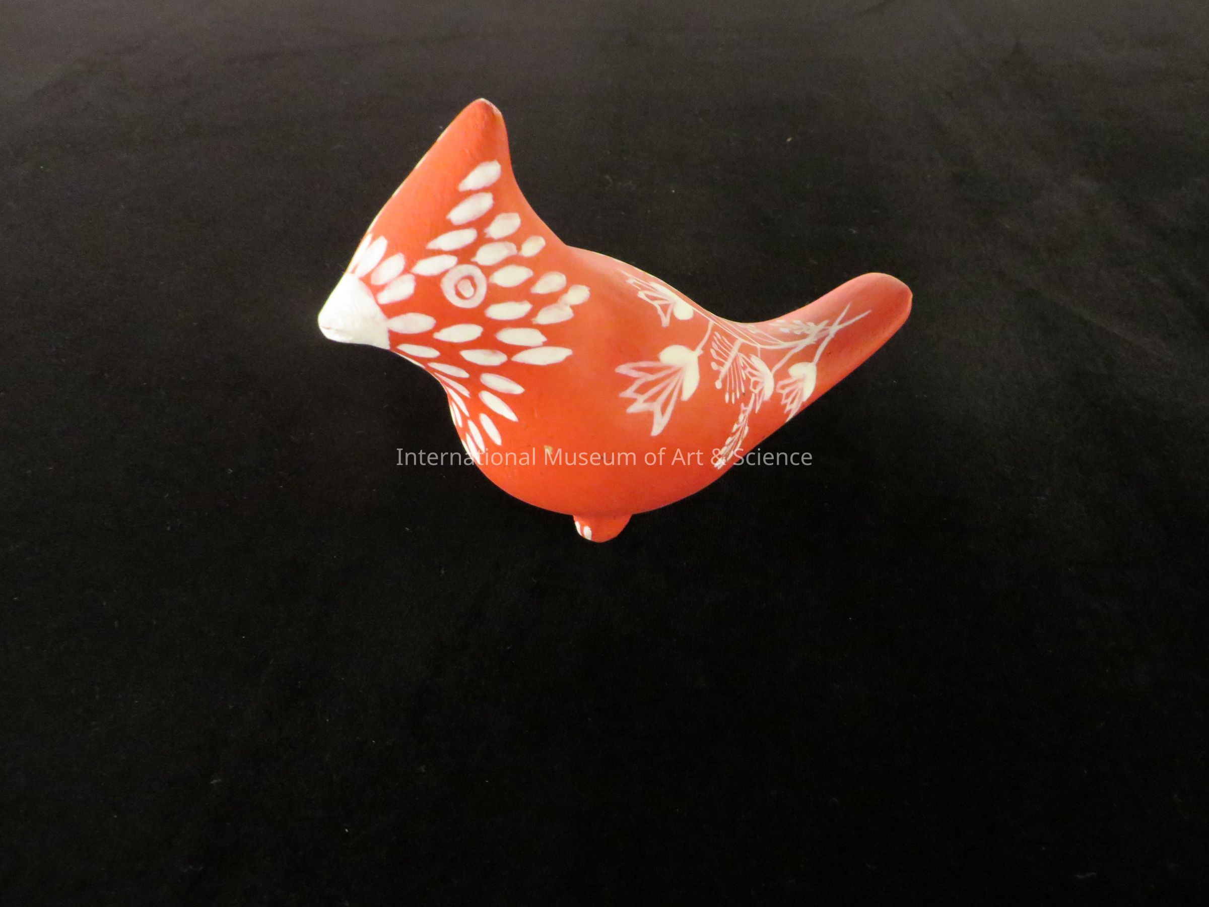 A ceramic figurine. This figurine is in the shape of a bird. It is painted with a red body with white floral detail on back and tail, and has a white bill. There is an inscription on the underside: Ärtesania Potosina Mexico."Made/Created