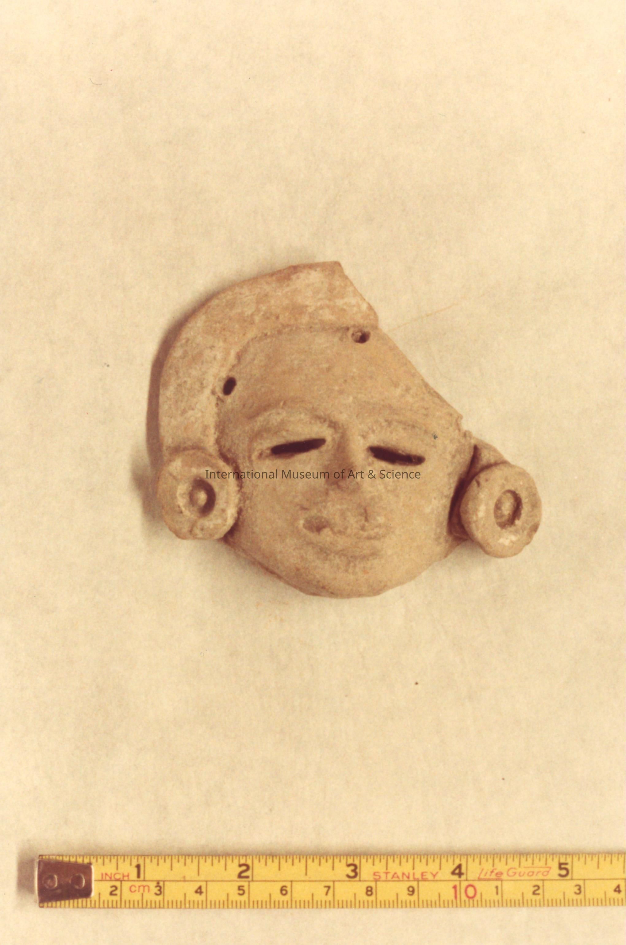 A clay head. The head has downcast applied eyes and a small pointed nose. It is wearing a close fitting headband and large earrings.