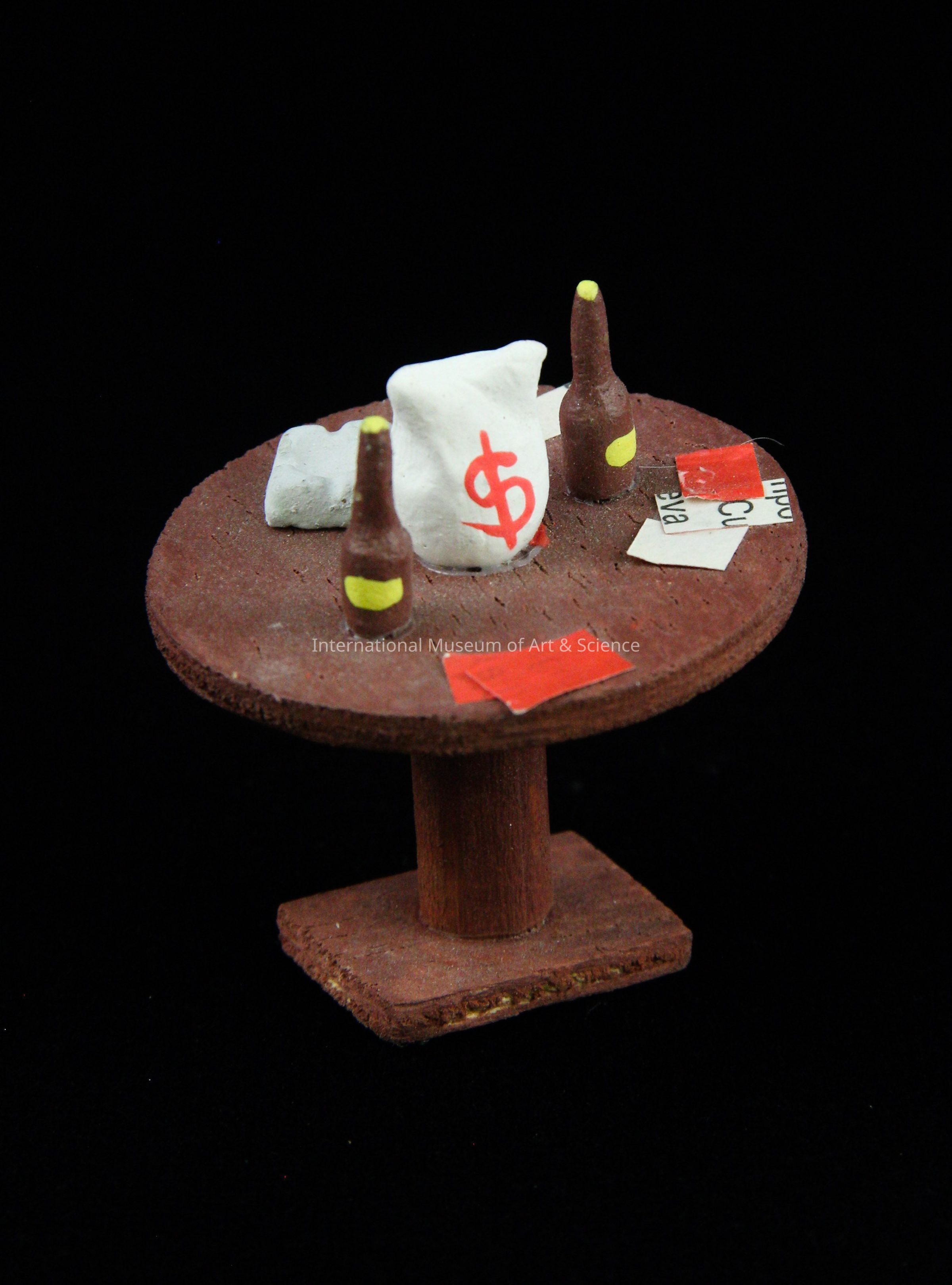 A miniature round table. The table is painted brown and has a accessories to a card game sitting on top. On the table is a white money bag, an ash tray, and two beer bottls, all made from clay and then painted. Also on the table are some playing cards cut from small pieces of red paper.Artwork Details