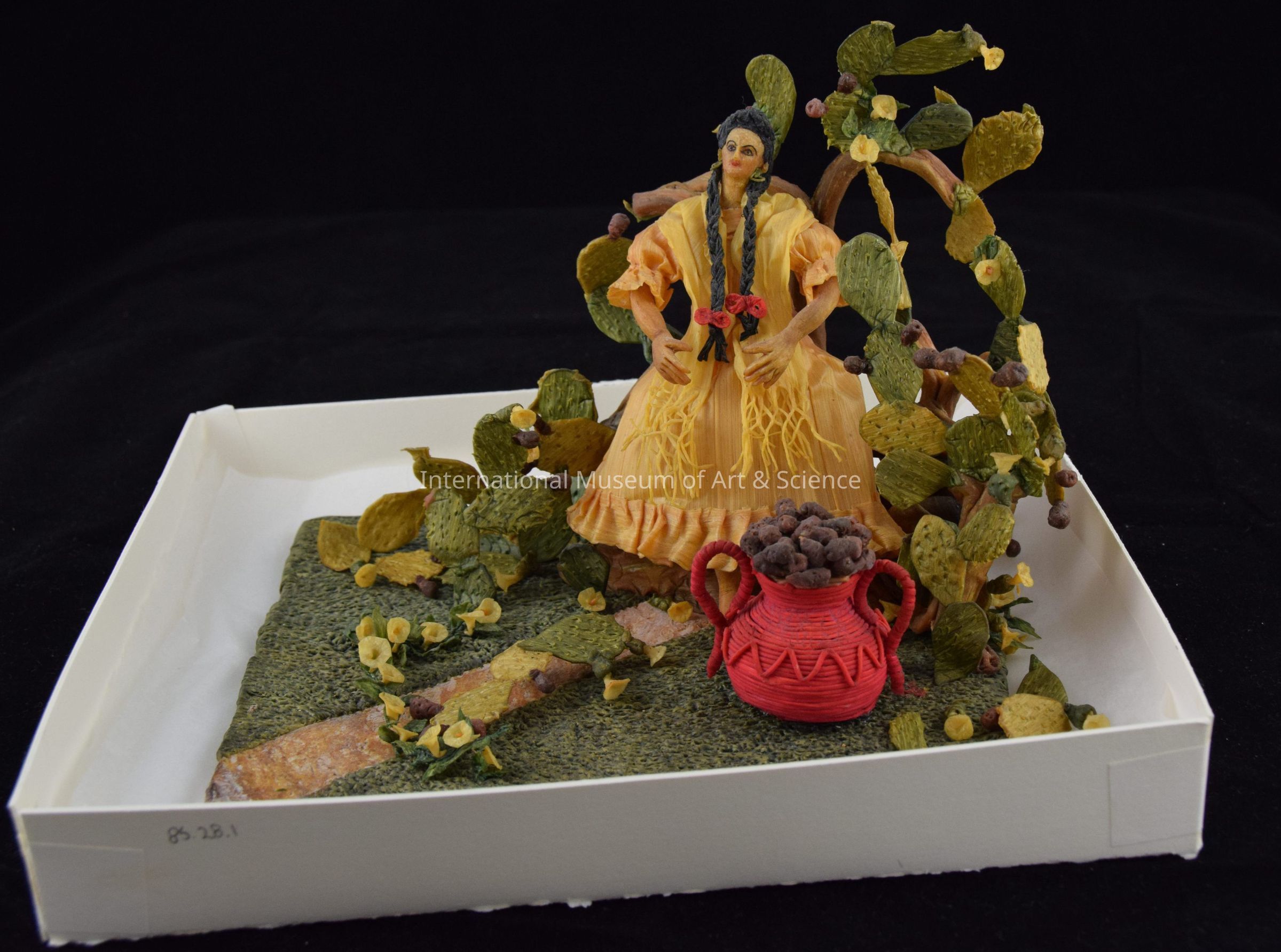 Woman sitting by cactus plants. Woman is wearing a pink dress, white fringed scarf, black braided hair tied at the end with a red bow, green shoes and earrings; sitting by cactus plants of light and dark green with small white flowers attached and red cactus fruit; red basket with two handles filled with cactus fruit; rectangular base of green and brown. Entire scene made of thinly worked slabs of chicle.Dimensions