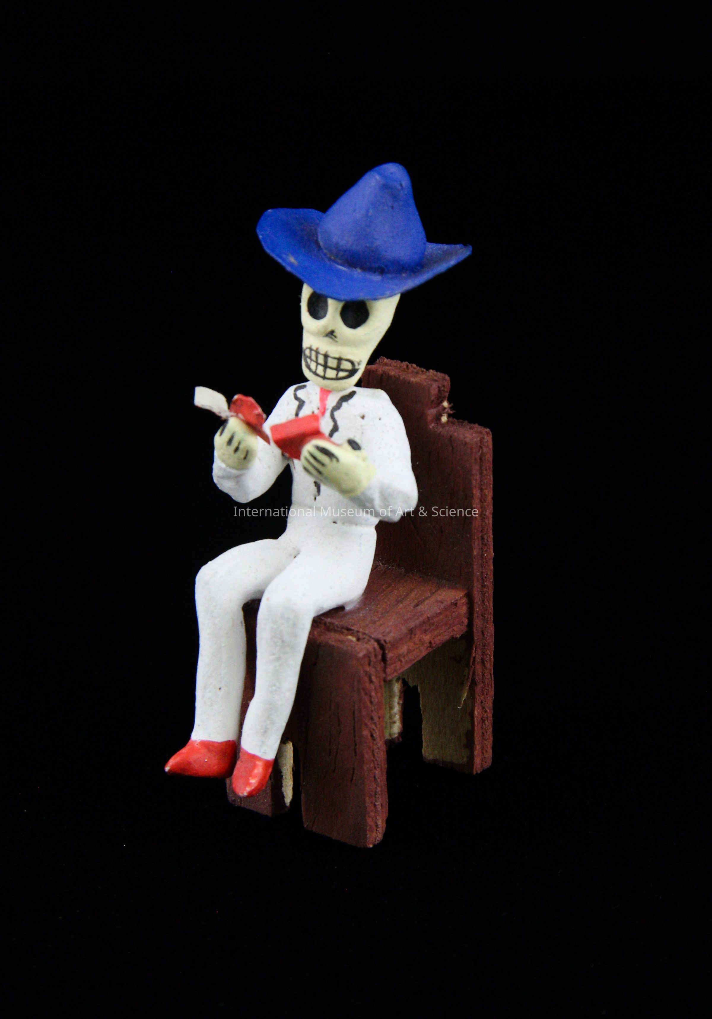 A clay skeleton figure seated on brown wooden chair. He is wearing a blue hat, a white suit, and red shoes. He is holding three cards in his hands. This figurine is part of a set of three.Artwork Details