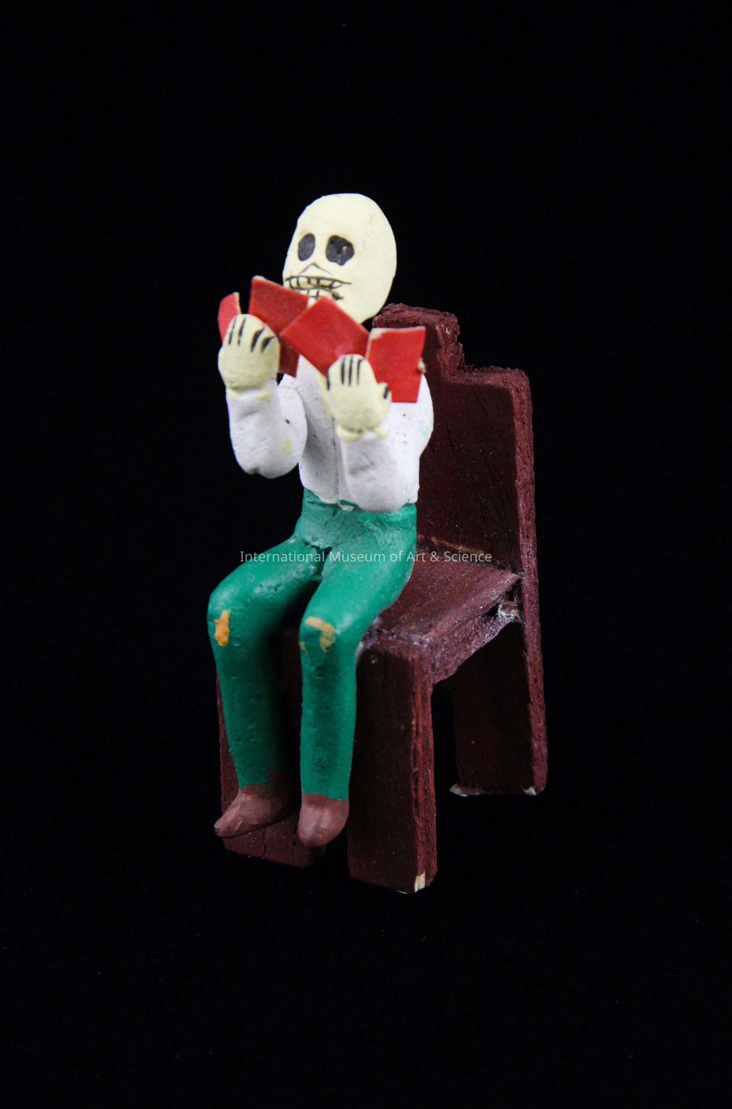 A clay skeleton figure seated on brown wooden chair. He is holding four cards in his hands. He is wearing a white shirt with green pants. This figurine is part of a set of three.Artwork Details