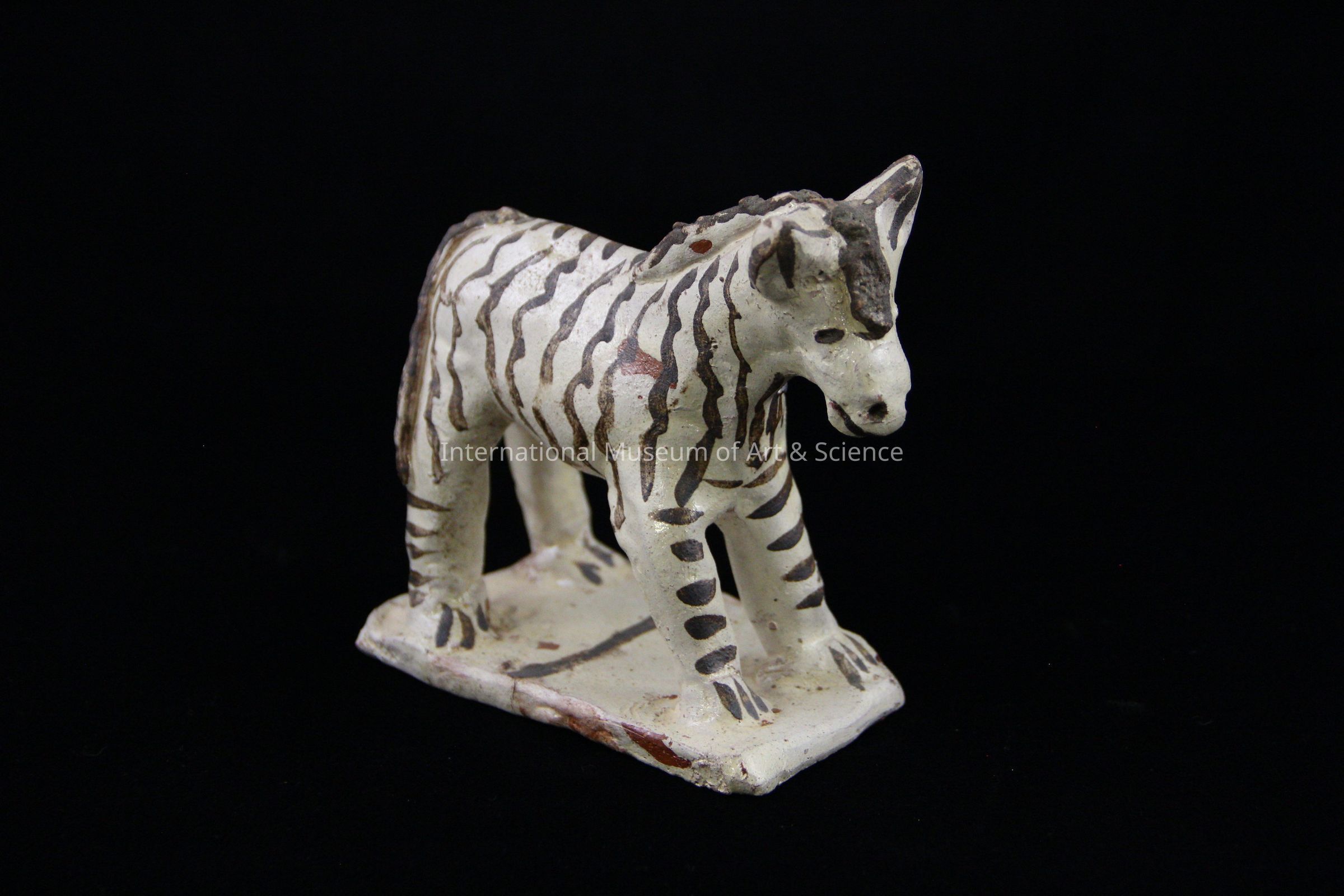 A ceramic pony. The figurine has a cream background, brown horizontal striped legs, brown vertical curvilinear stripes on his body, striped pointed ears, and a brown tail and mane. It stands on a rectangular base with brown vertical stripe at center. It is part of a group of animals from a Nativity scene.Ethnography