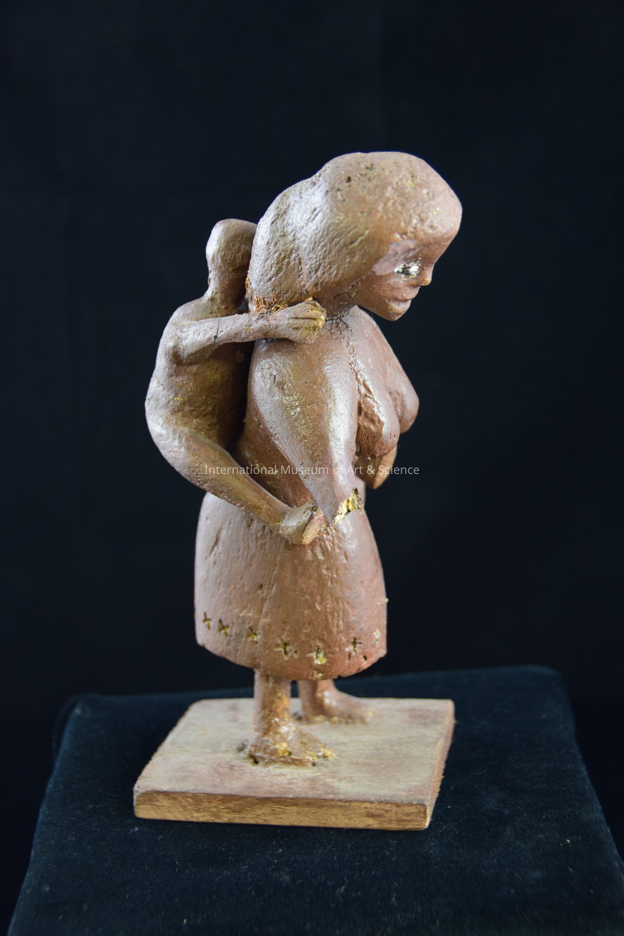 A wood carved figurine. The figurine is a woman carrying a child on her back. The child has its legs around the woman's waist, and its hands over her shoulders. The whole piece is painted brown, with white and black details painted for the eyes. There are details carved at the hem of the woman's dress. The figure stands on a wood base.Dimensions