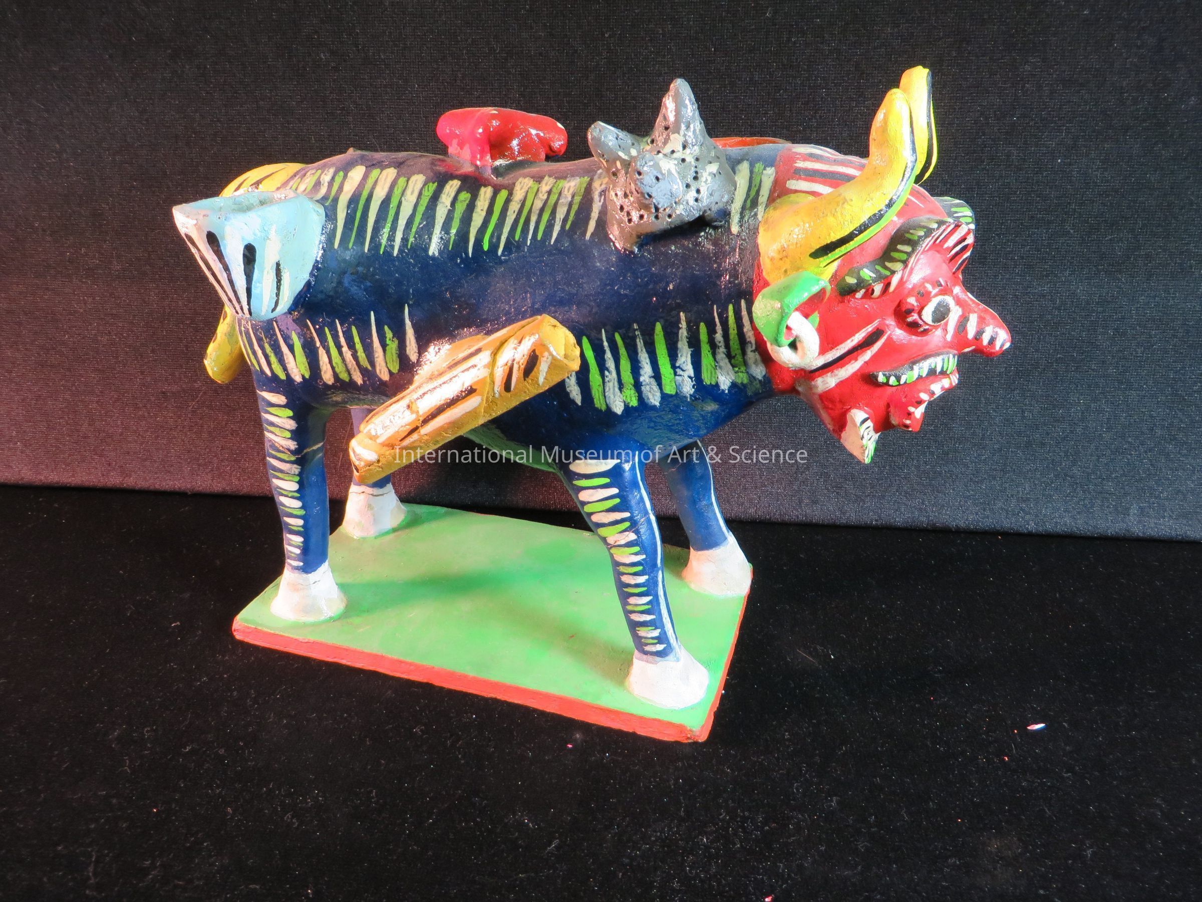 Bull with devil's face; Large bull on rectangular base painted light green with red-orange sides; Large bull is painted dark blue with green and white scattered stripes; red devil's face with yellow striped horns and tail; green ears; carrying rolled mat, on his body nad kitchen accesories in relief; fray grinders, corn bag, black pan, orange and light blue bowls also attached. Fetish figureArtwork Details