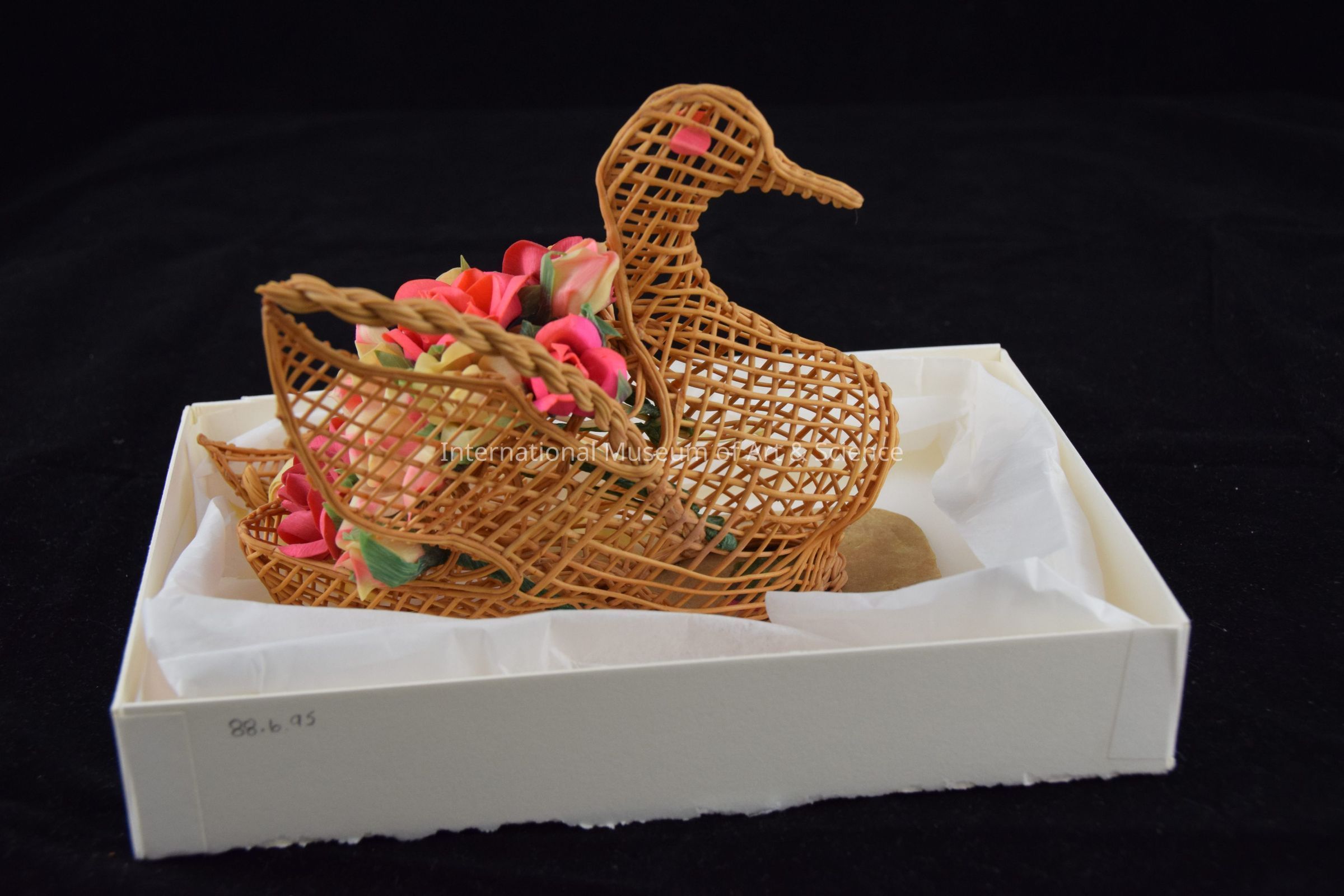 Swan with flowers. Brown open-weave swan on green square base made of chicle; multi-colored flowers on swan; flowers of red, yellow, pink and white with stripes; high twisted handle with yellowand white bow at center top.Dimensions