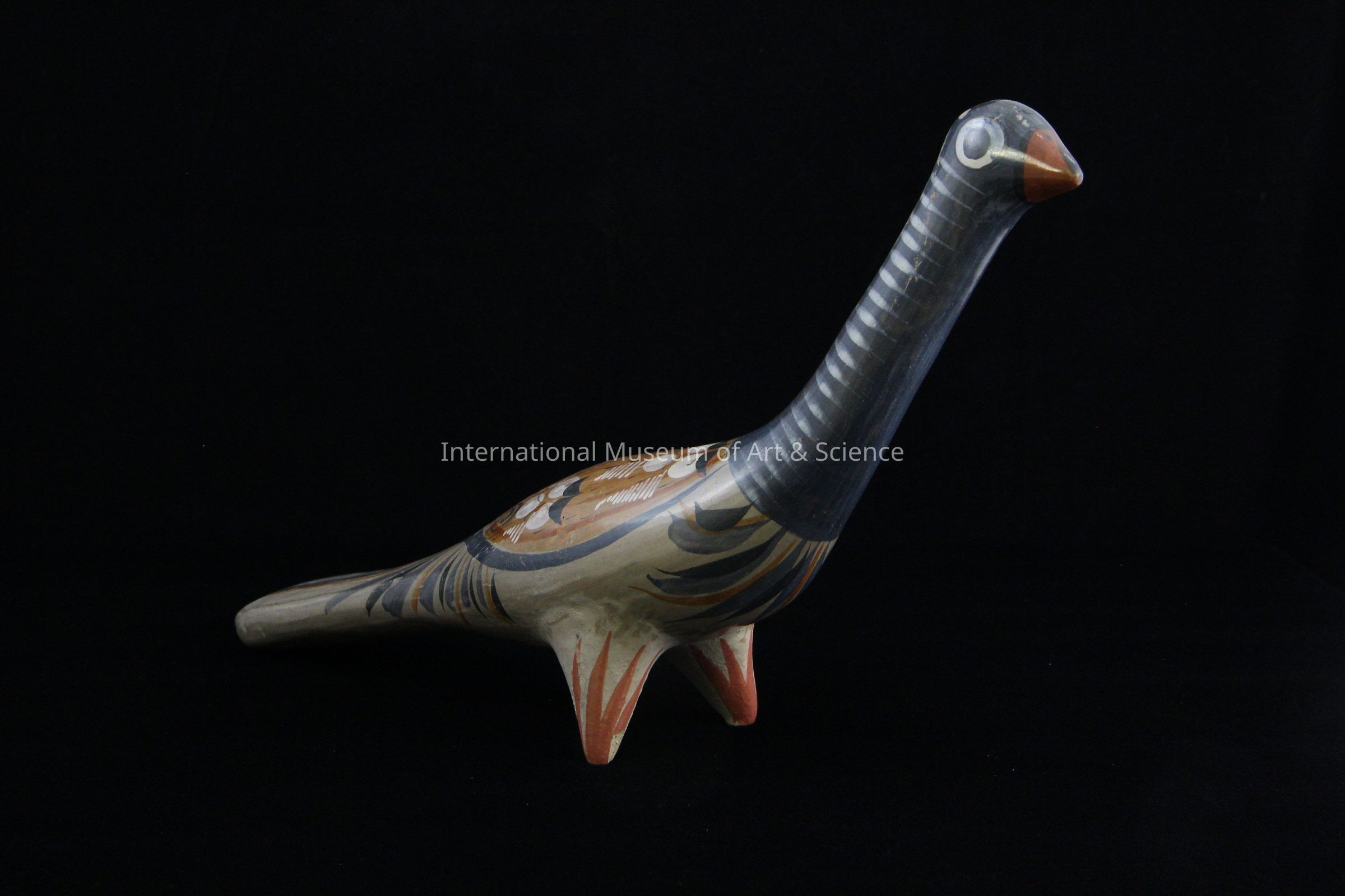 A burnished clay figurine of a bird. The bird has a long dark blue neck, with a beige, burnt orange, and grey body and tail. The back and tail of the bird and decorated with a floral motif.Ethnography