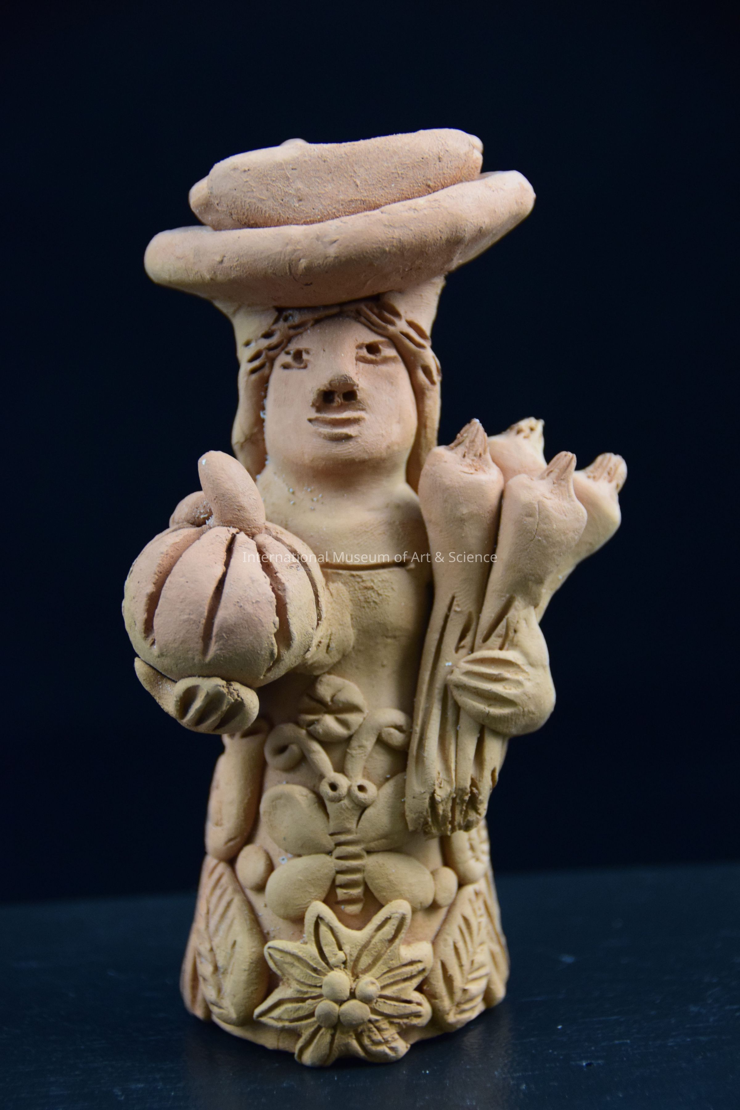 An unpainted clay woman with fruit. She holds a pumkin in her right hand and green leeks or onions in her left hand. There is a basket with loaves of bread on her head. The front of the woman's skirt is decorated with a large butterfly and 2 snails on either side of the butterfly. The flowers and leaves. On the back of the figurine, the woman long hair is done in pigtails and falls to the middle of the back. The figurine is unglazed.