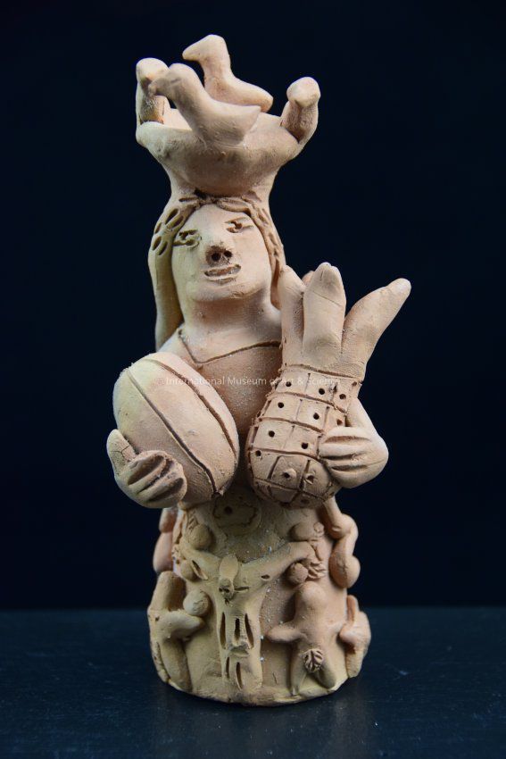 An unpainted clay woman with fruit. She holds a melon in her right hand and a pineapple in her left. She also has a basket on her head. There are four birds sitting on the edge of the basket. The woman's skirt is adorned with warriors human figures, stars and what appear to be leaves. On the back, the woman's long hair falls to the mid-back, it is done in pigtails. The figure is unglazed.Dimensions