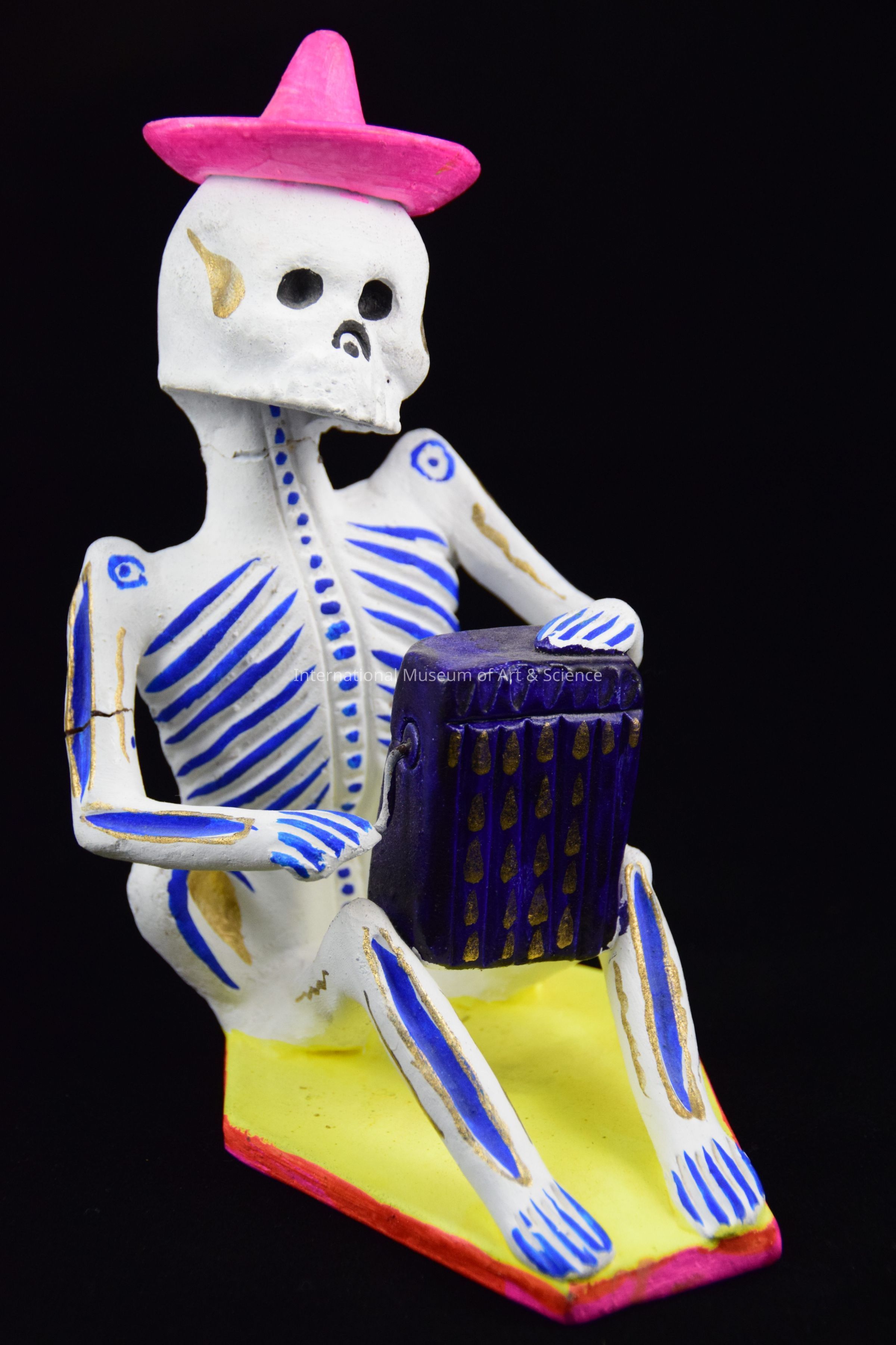 A clay figurine of a skeleton musican. The skeleton is seated on a yellow and pink base in the shape of a coffin. The skeleton is painted white with blue and gold detailing. It is wearing a pink hat. It is playing purple and gold musical crank box. It is a part of a group of 5 skeleton musicans.