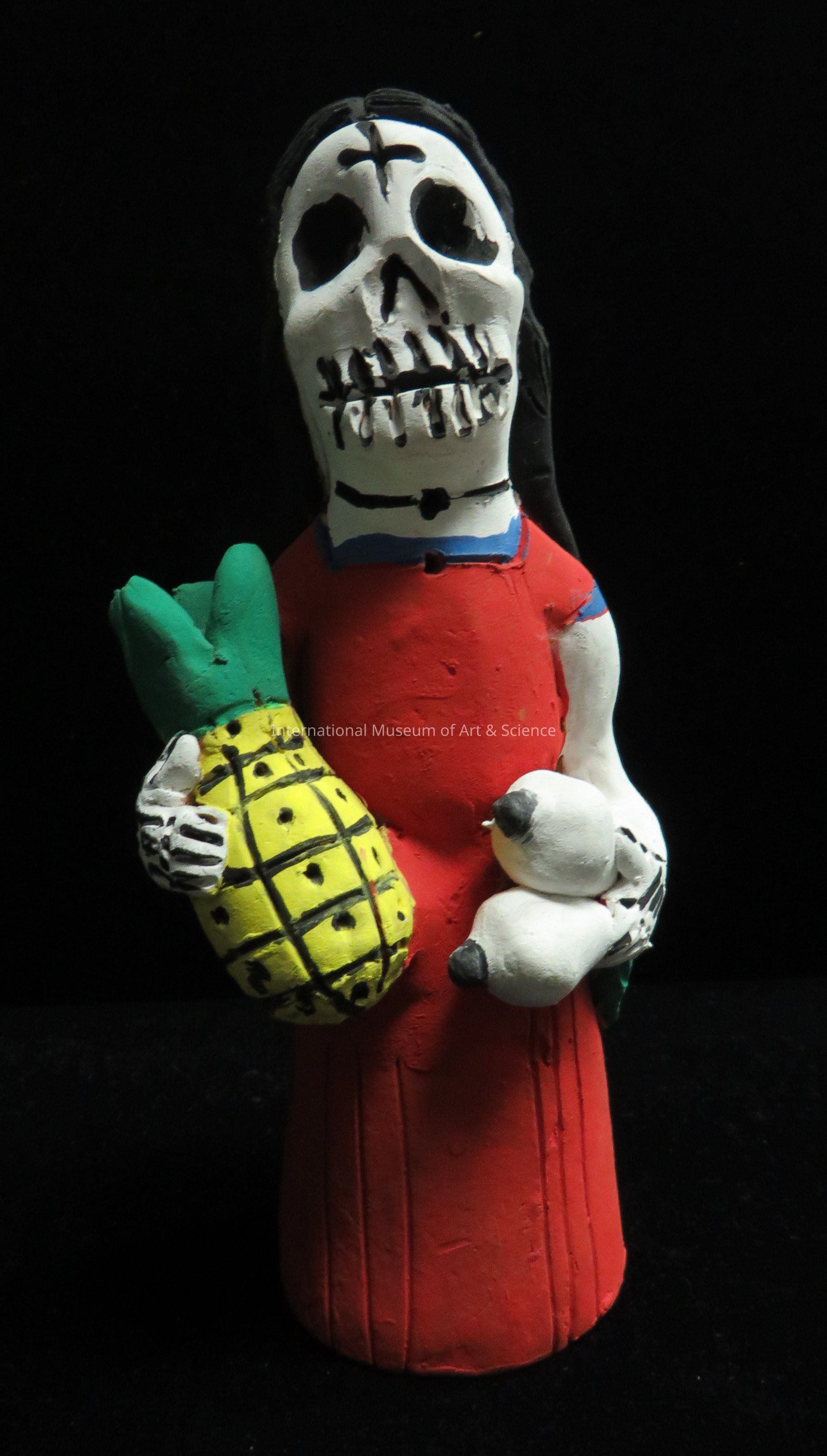 A ceramic figurine of a skeleton wearing red dress - holding pineapple and onions. Part of set of five skeleton women with white skull faces and black hair, and crosses on forehead.Dimensions