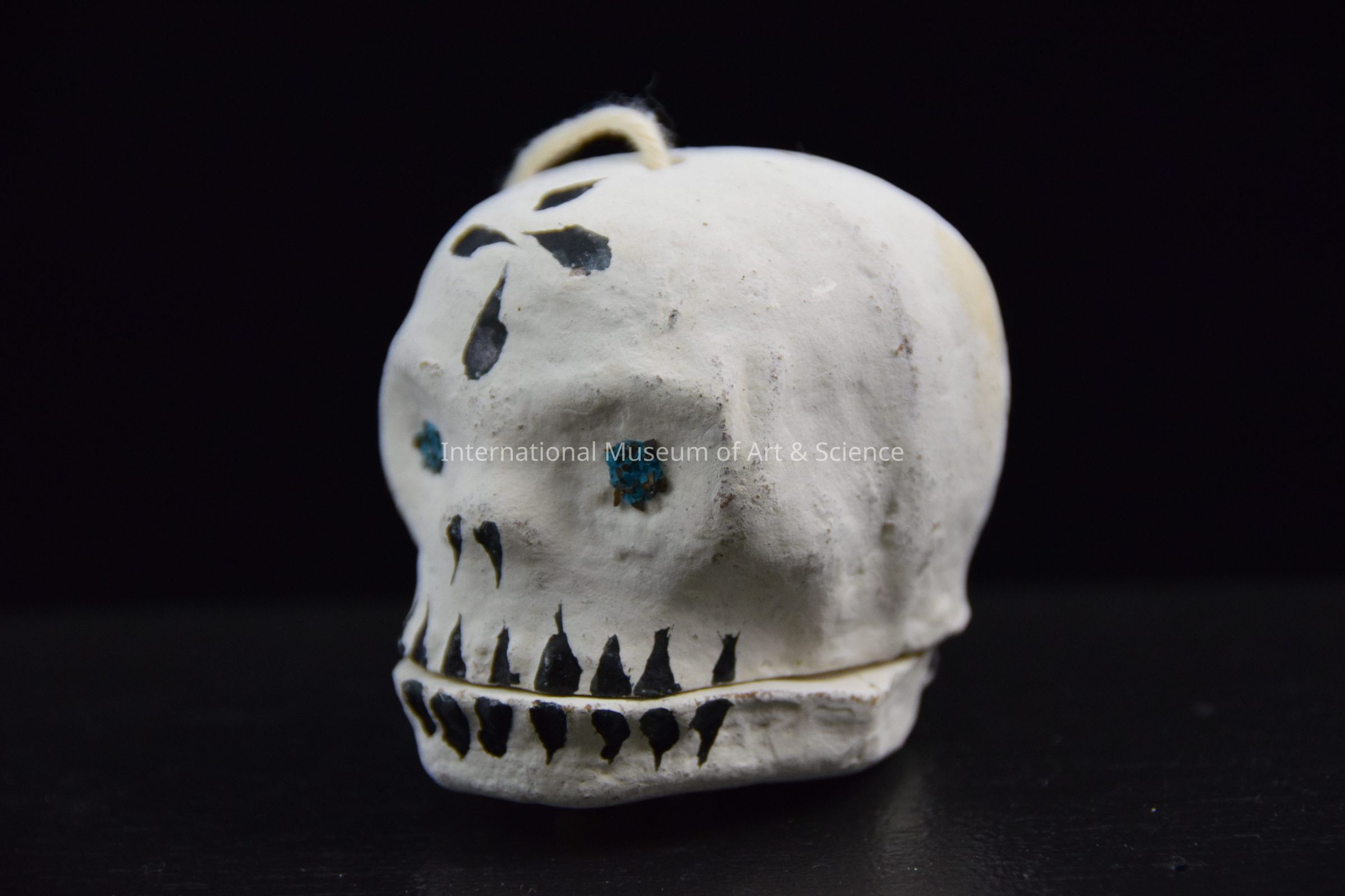 A small white ceramic skull. Its mouth opens with a string. It has black detailing and blue glittery eyes.