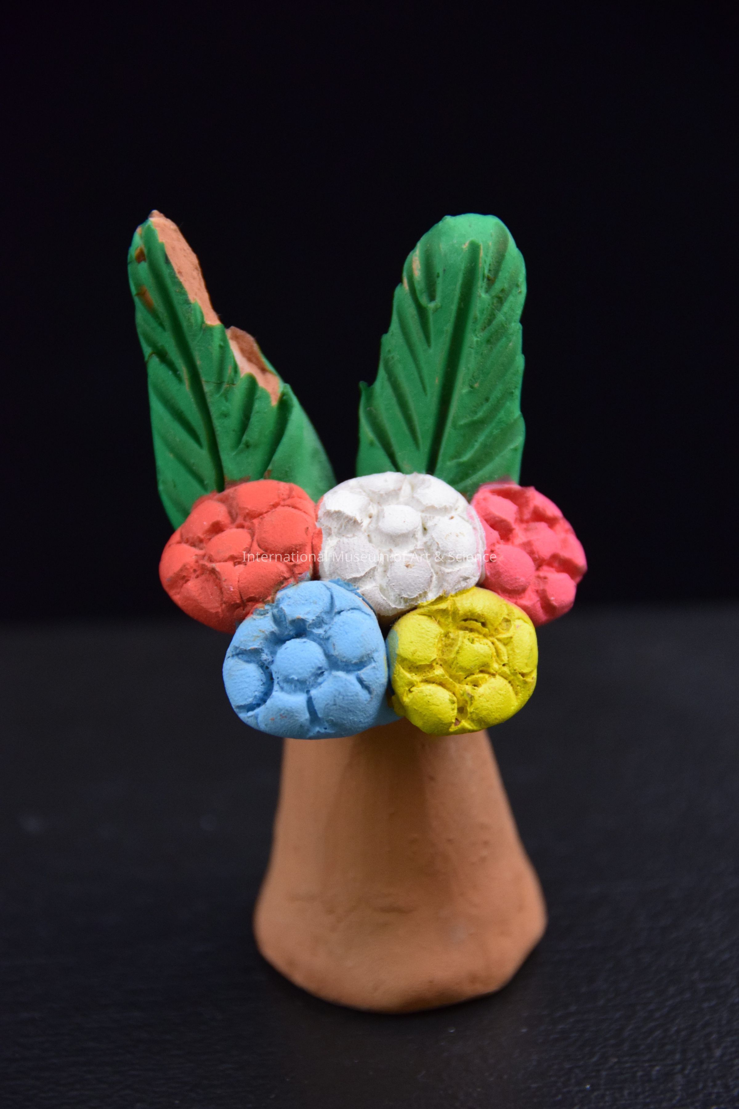 A ceramic figurine of a vase with flowers. The vase is unpainted. The flowers are painted red, blue, yellow, pink, and white with two large green palm leaves that the back. It is part of a 19 piece set of offierings for a Day of the Dead altar.Made/Created