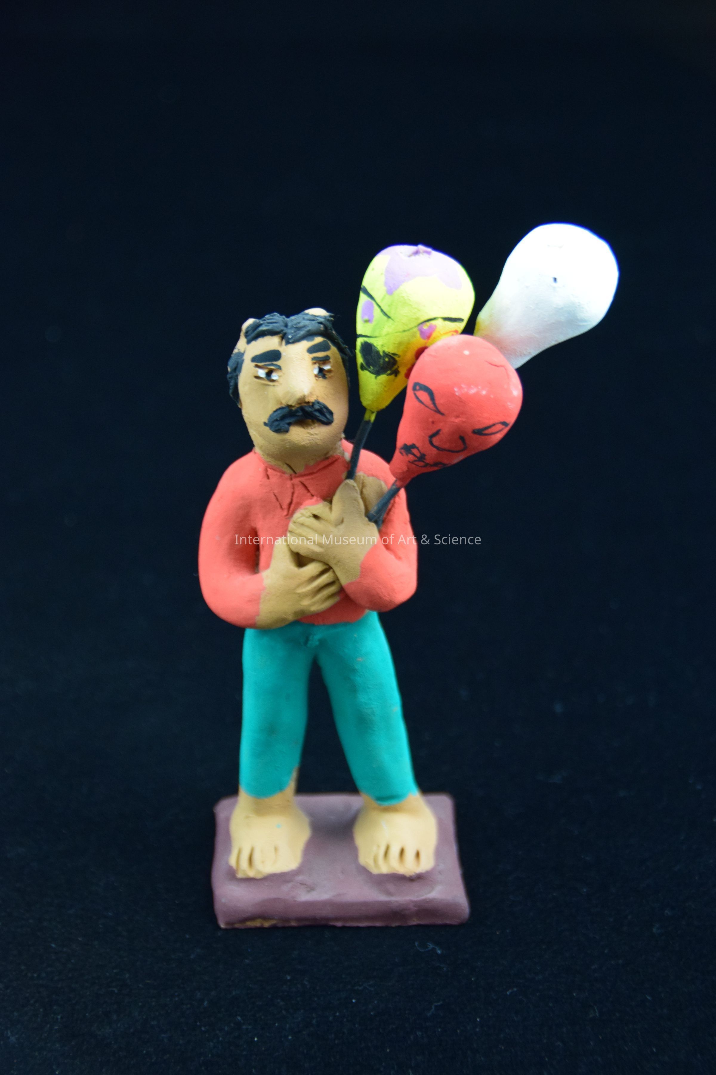 Clay figure of a man wearing green pants and orange shirt holding 3 balloons. He is part of a Zocalo scene. The scene has 28 clay pieces brightly painted, representing a park scene.Dimensions