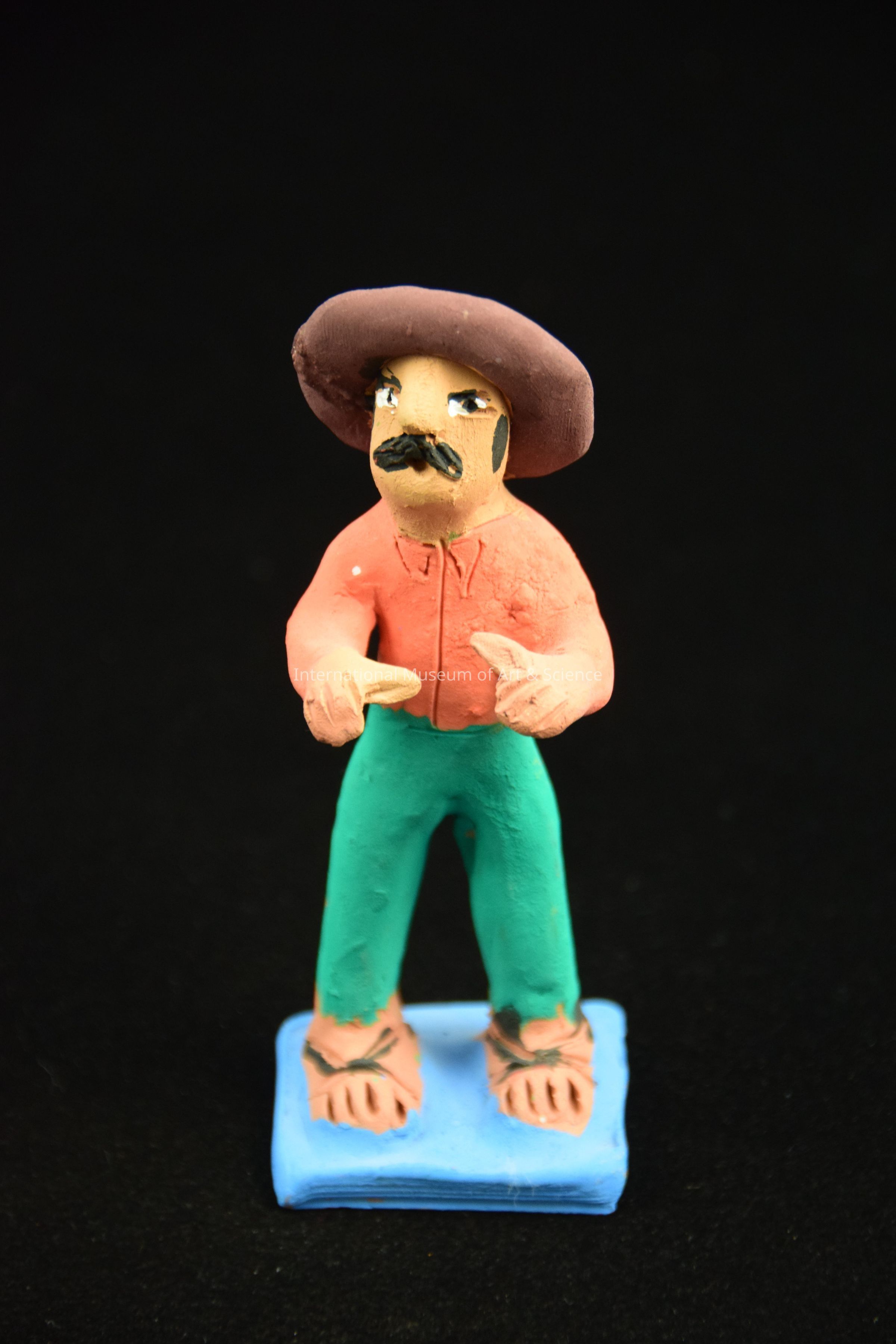 A clay figurine of a man in green pants and an orange shirt. He is the vendor for the white ice cream cart. He is part of a Zocalo scene. The scene has 28 clay pieces brightly painted, representing a park scene.
