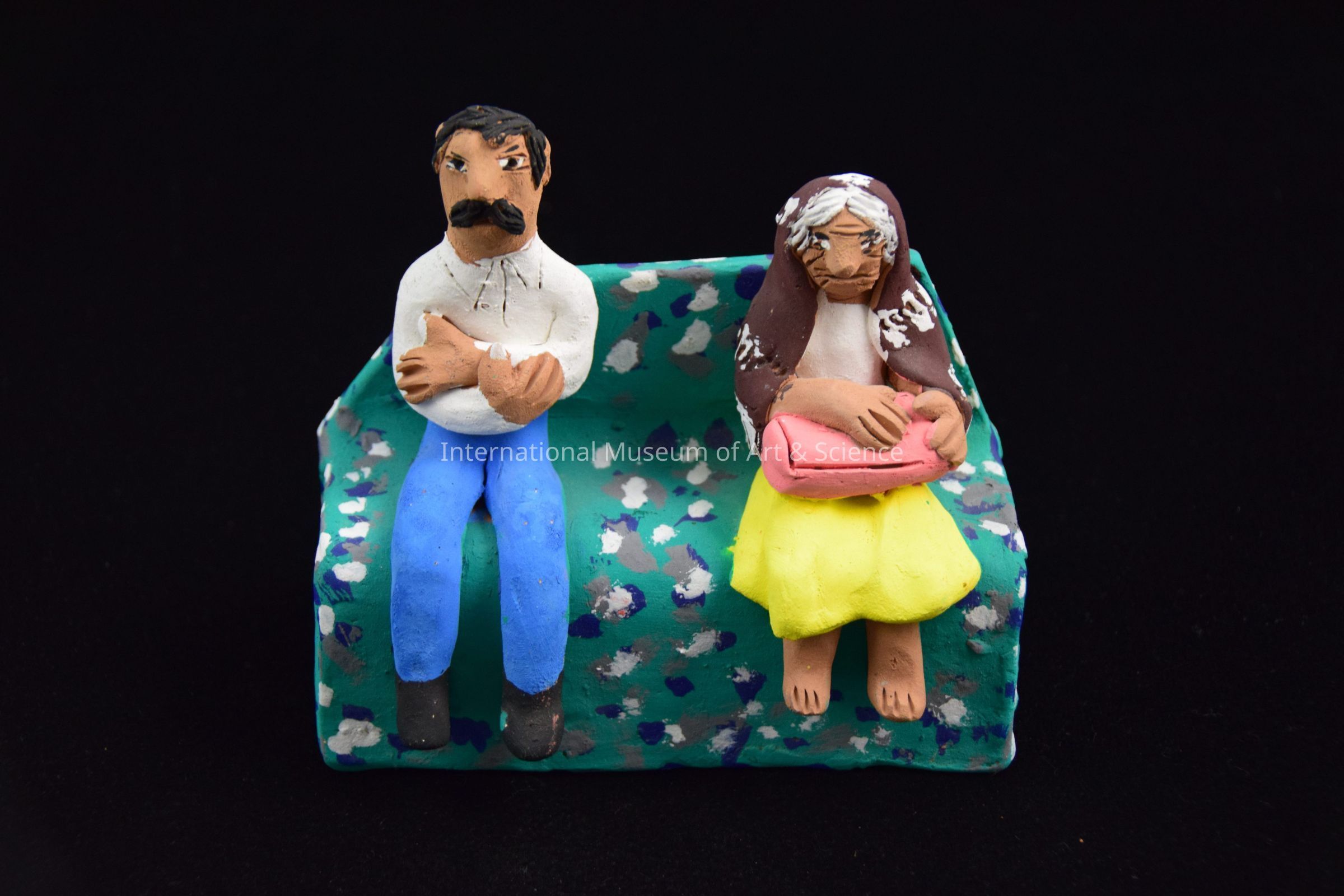 Two clay figures sitting on a bench. They are part of a Zocalo scene. The scene has 28 clay pieces brightly painted, representing a park scene.