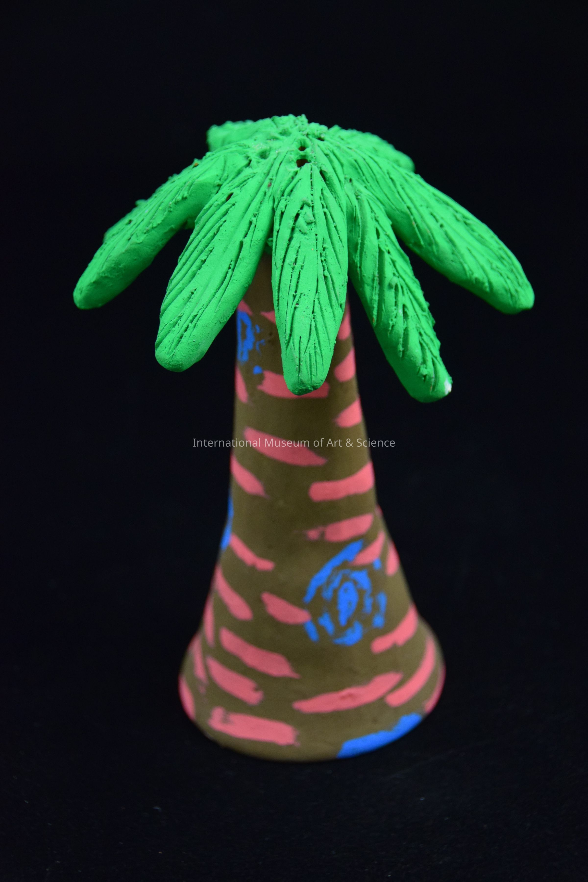 A ceramic figurine of a palm tree. The tree has a brown painted trunk with pink and blue detailing and green palm leaves on top. It is part of a Zocalo scene. The scene has 28 clay pieces brightly painted, representing a park scene.