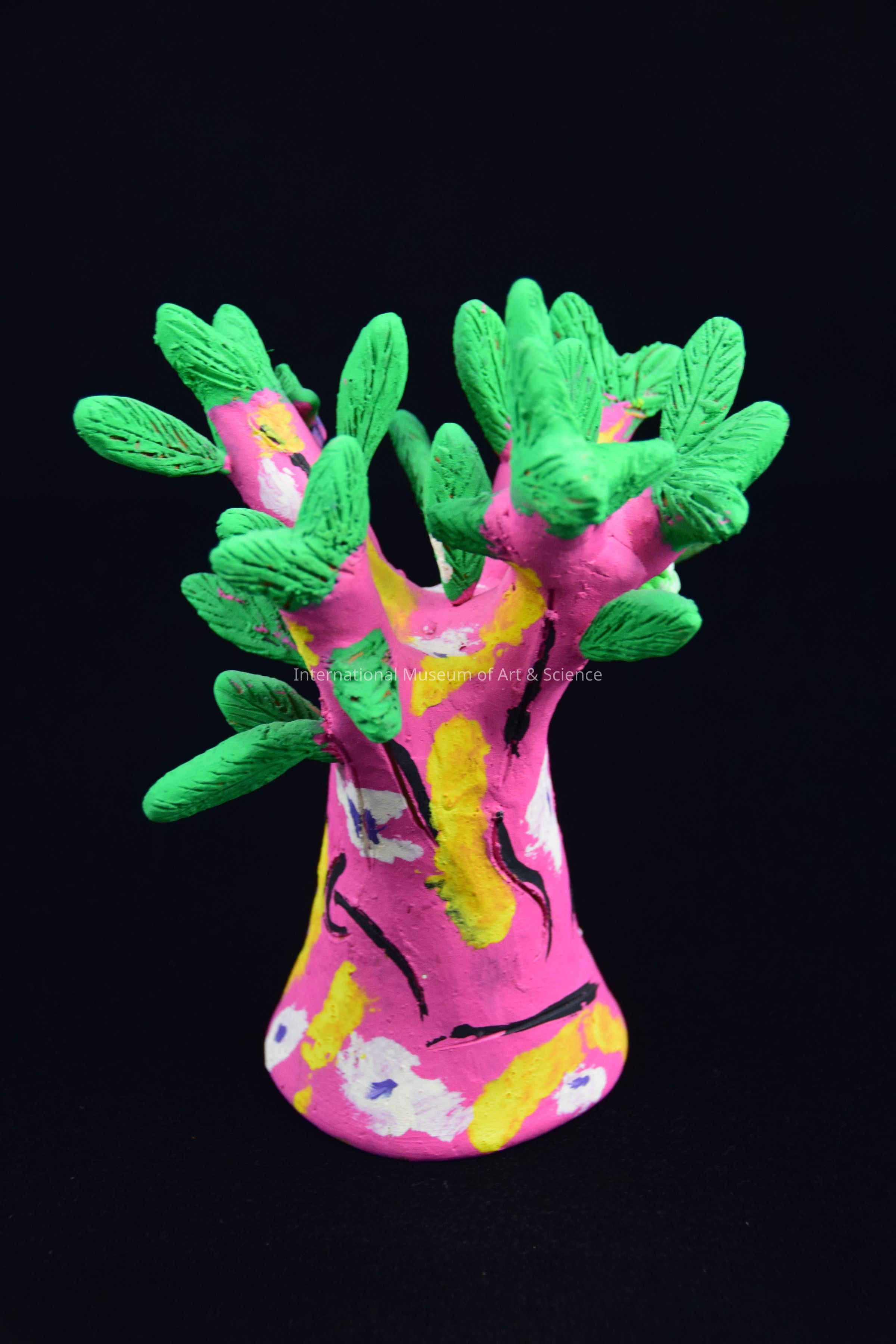 Clay palm tree figurine. It is a magenta multicolored tree w/ purple fruit and green fruit. It is part of a set of 12 clay palm trees.Dimensions
