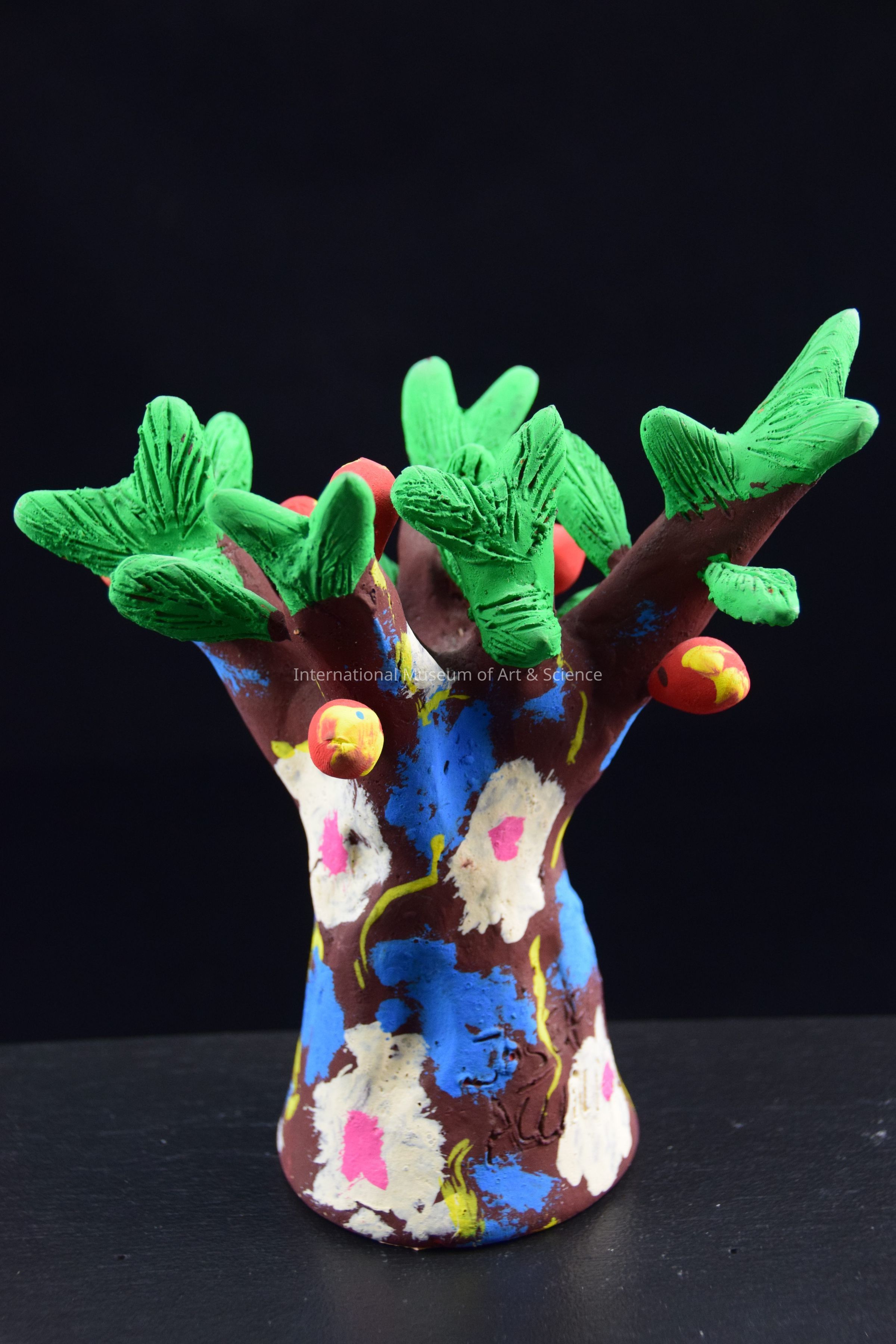 Clay palm tree figurine. It is a brown multicolored tree with red and yellow fruit. It is part of a set of 12 clay palm trees.