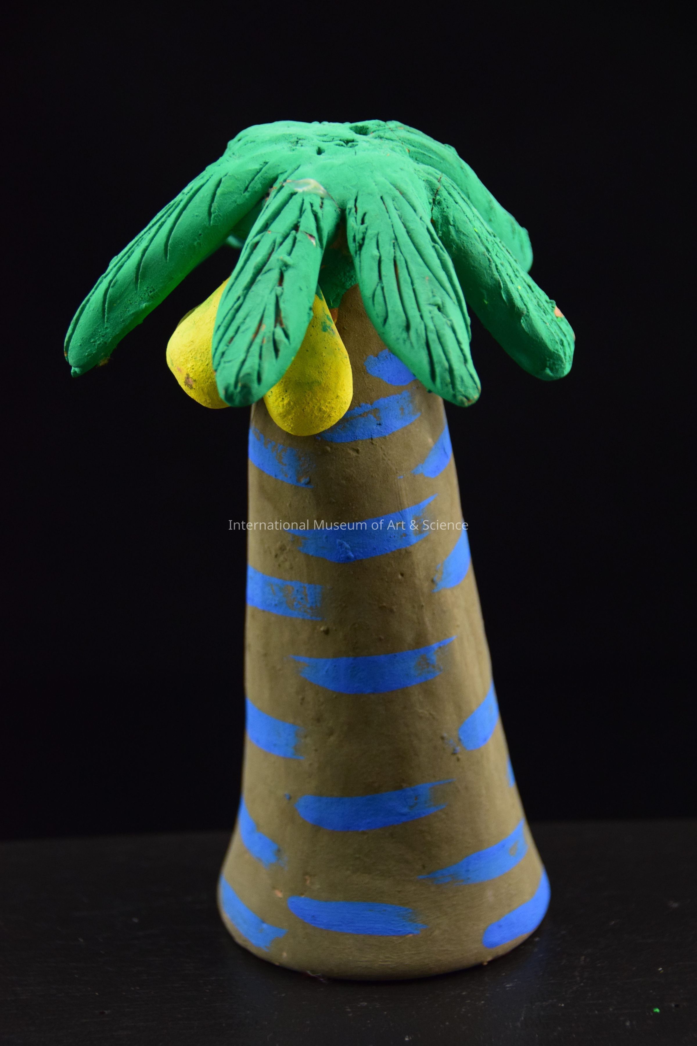 Clay palm tree figurine. It is a grey/brown tree with blue stripes, and three yellow coconuts. It is part of a set of 12 clay palm trees.