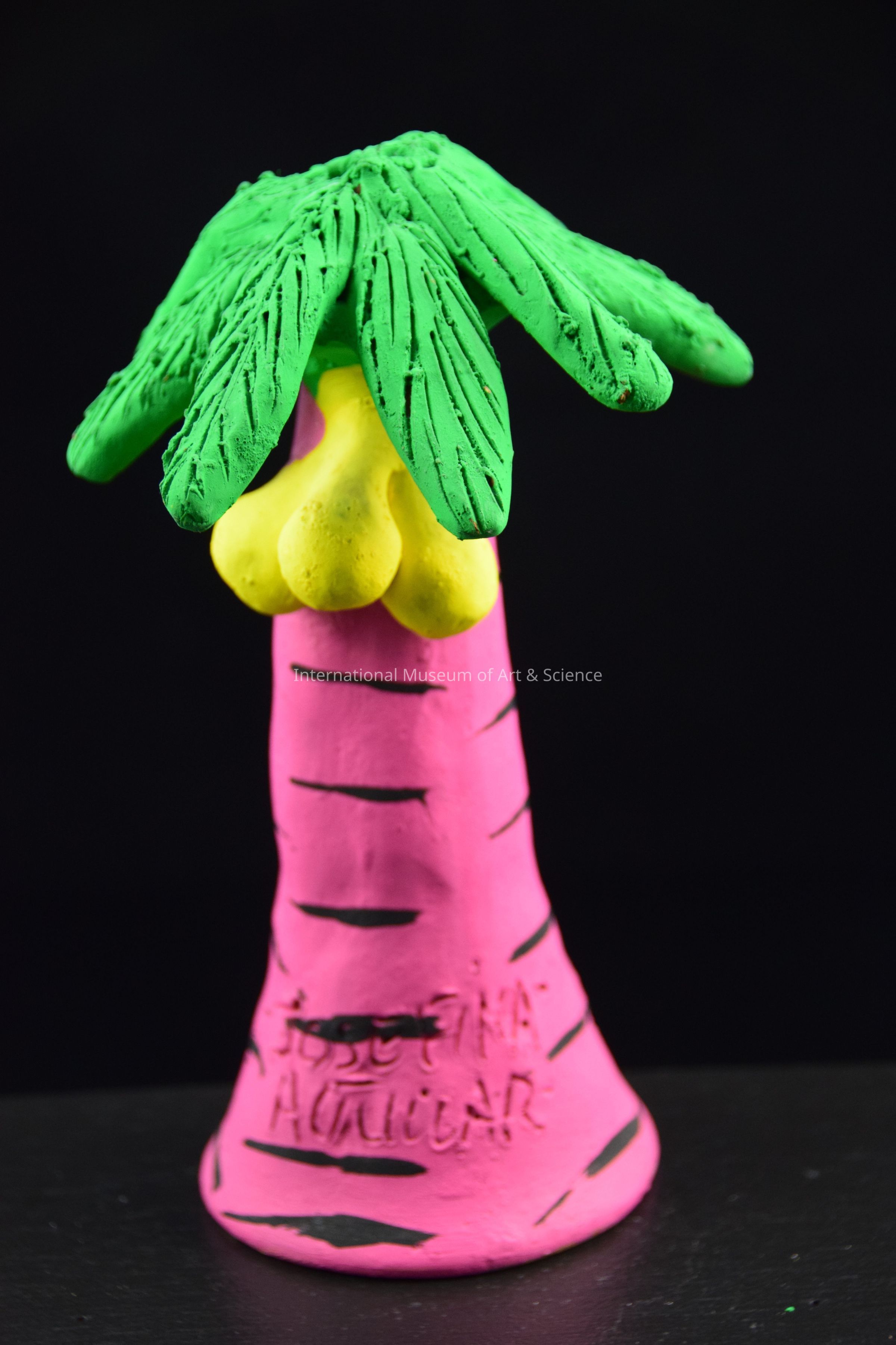 Clay palm tree figurine. It is a magenta tree with black stripes, and three yellow coconuts. It is part of a set of 12 clay palm trees.