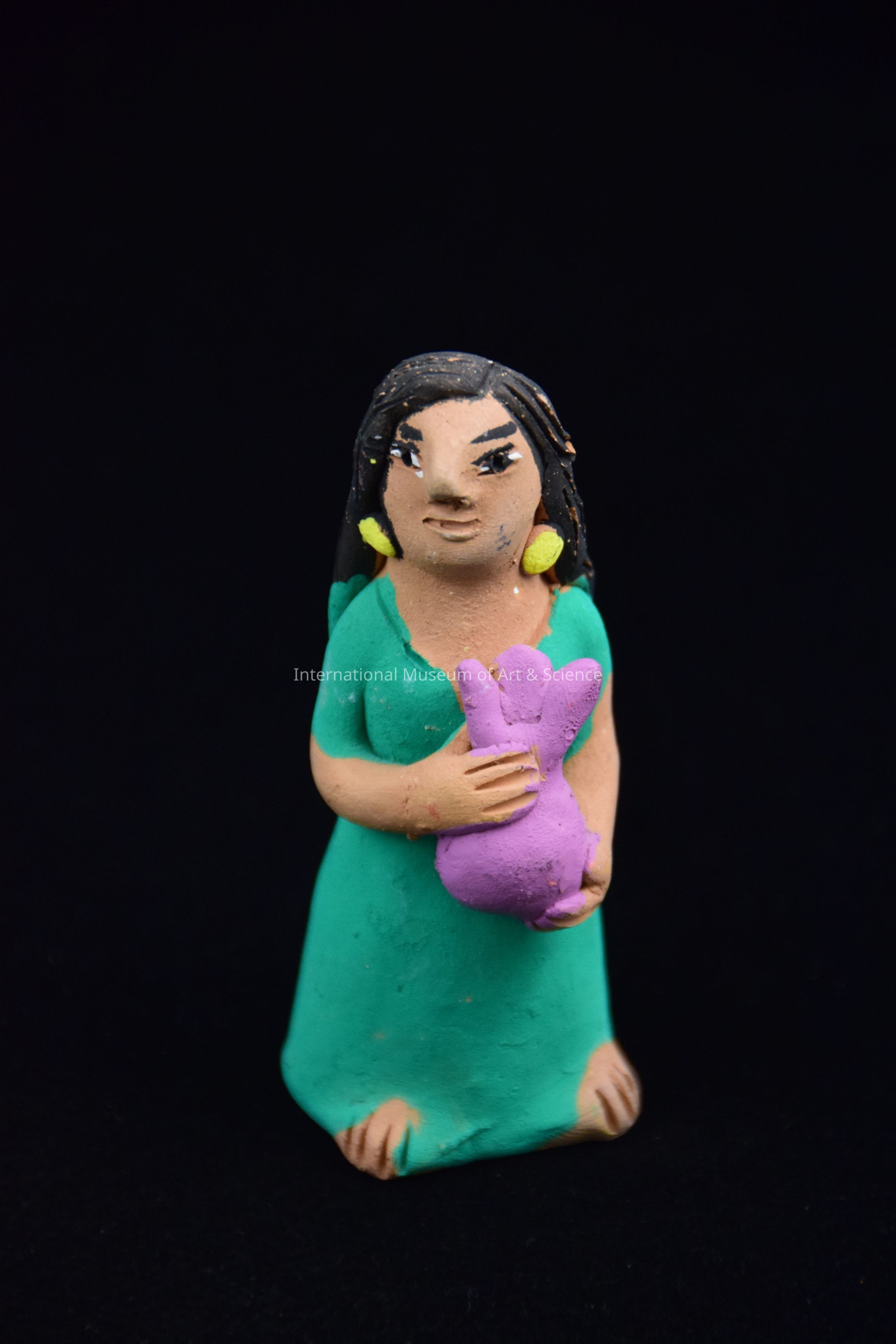 Clay figure of a woman in a green dress holding a purple fruit. She is part of a Zocalo scene. The scene has 28 clay pieces brightly painted, representing a park scene.