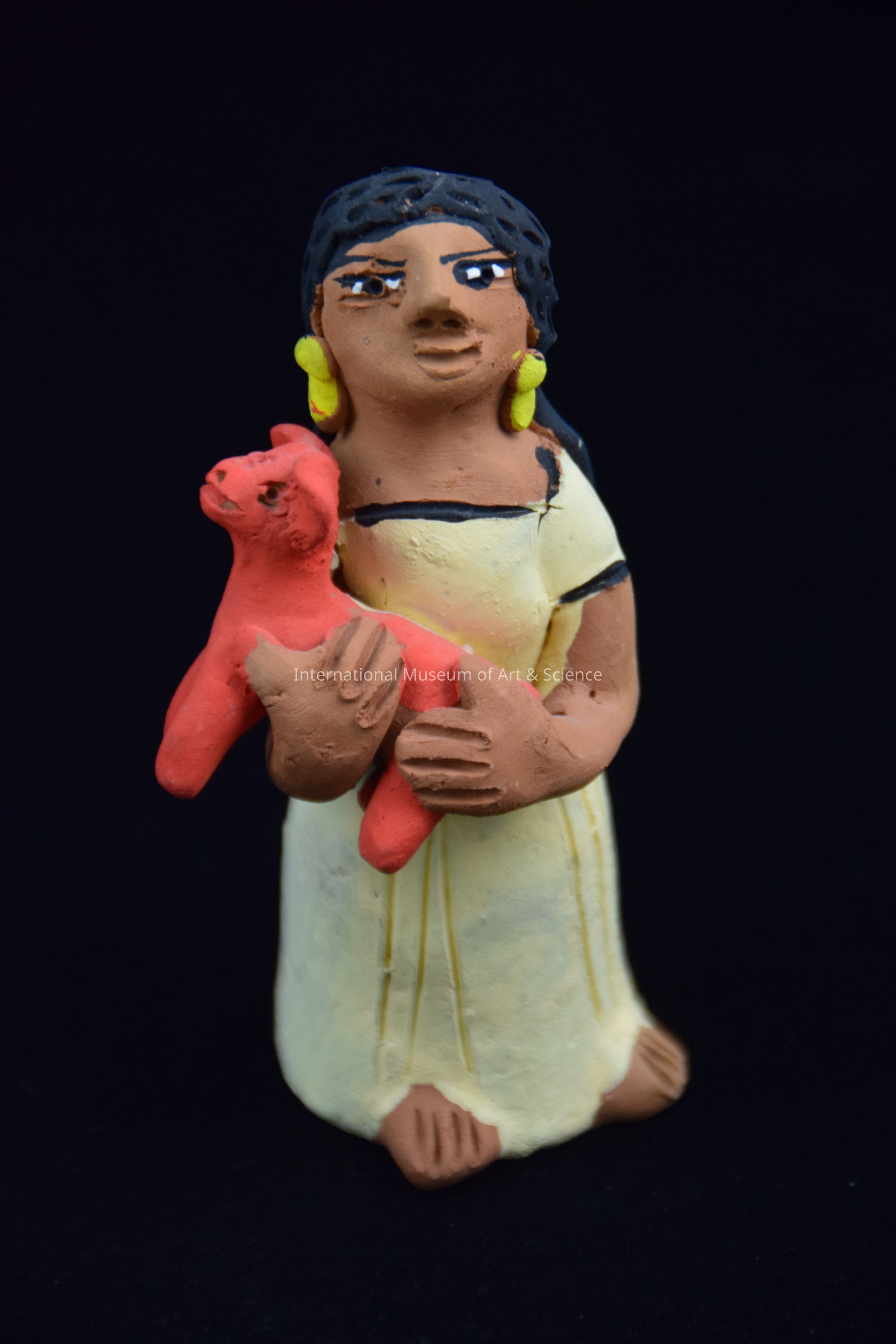 Clay figure of a woman in a beige dress holding a calf. She is part of a Zocalo scene. The scene has 28 clay pieces brightly painted, representing a park scene.Dimensions