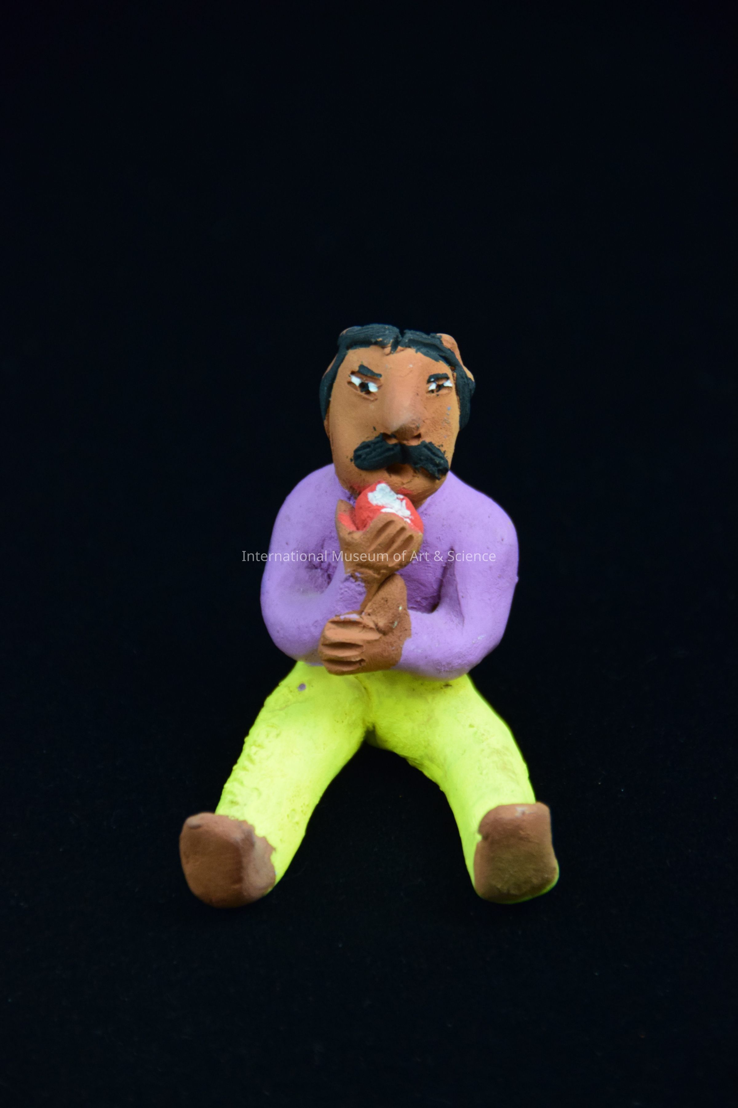 Clay figure of a man sitting down wearing yellow pants and a purple shirt eating an apple. He is part of a Zocalo scene. The scene has 28 clay pieces brightly painted, representing a park scene.Dimensions
