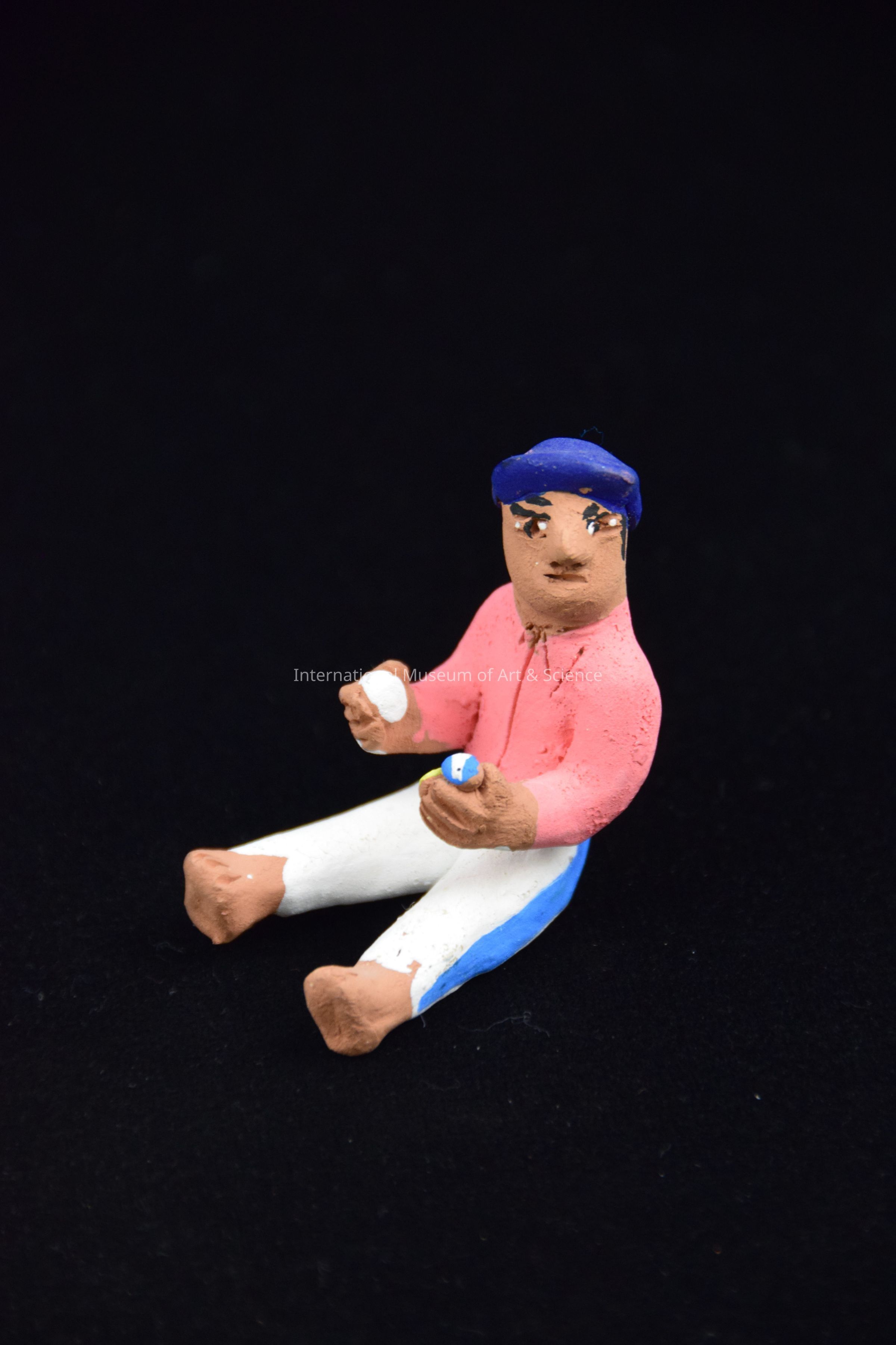 Clay figure of a man, white pants with a blue stripe and a pink/peach shirt. He is sitting and eatting a piece of fruit. He is part of a Zocalo scene. The scene has 28 clay pieces brightly painted, representing a park scene.Dimensions