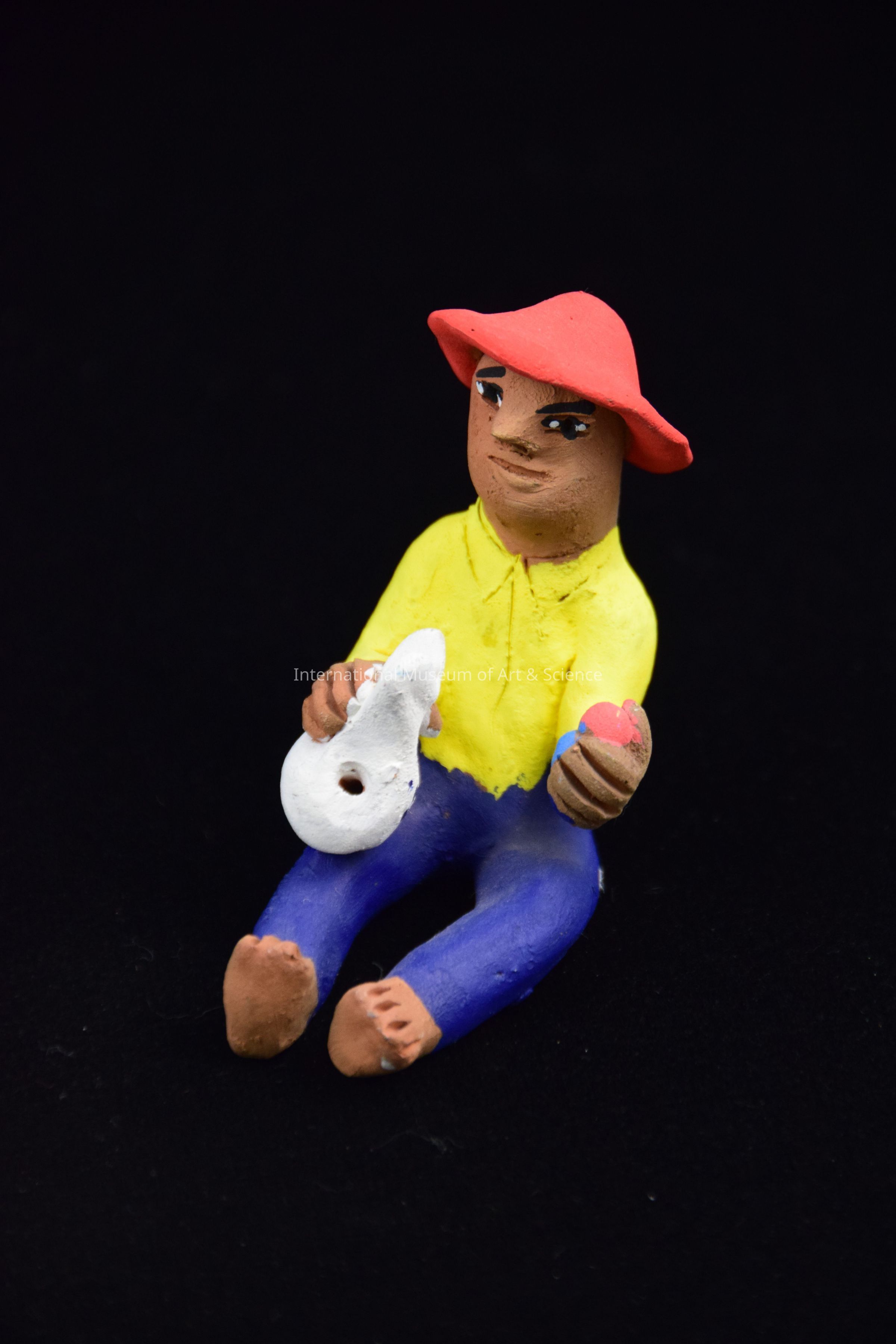 Clay figure of a boy sitting down wearing blue pants, a yellow shirt, and a red hat. He is part of a Zocalo scene. The scene has 28 clay pieces brightly painted, representing a park scene.Dimensions