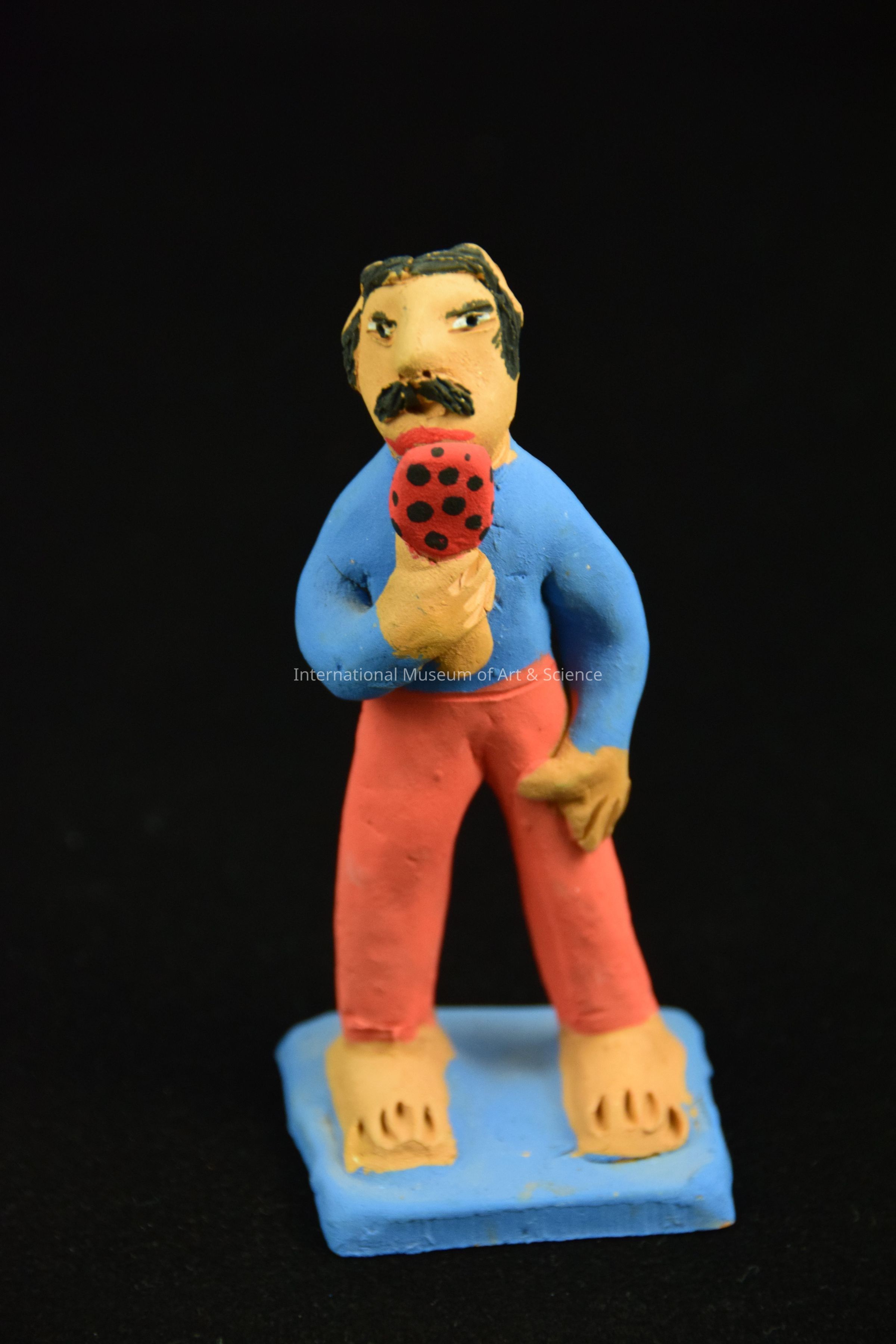 Clay figure of man wearing red pants and blue shirt, holding a red lollipop. He stands on a blue base. He is part of a Zocalo scene. The scene has 28 clay pieces brightly painted, representing a park scene.Dimensions