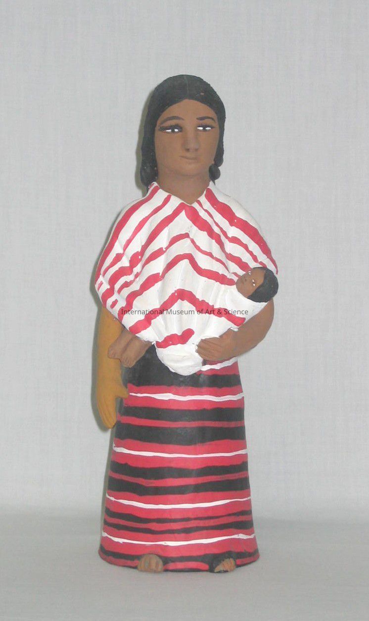 A clay figurine of a woman. She is wearing a multicolored striped skirt. She has a red and white striped shawl around her shoulders which she is using to hold a baby.Made/Created