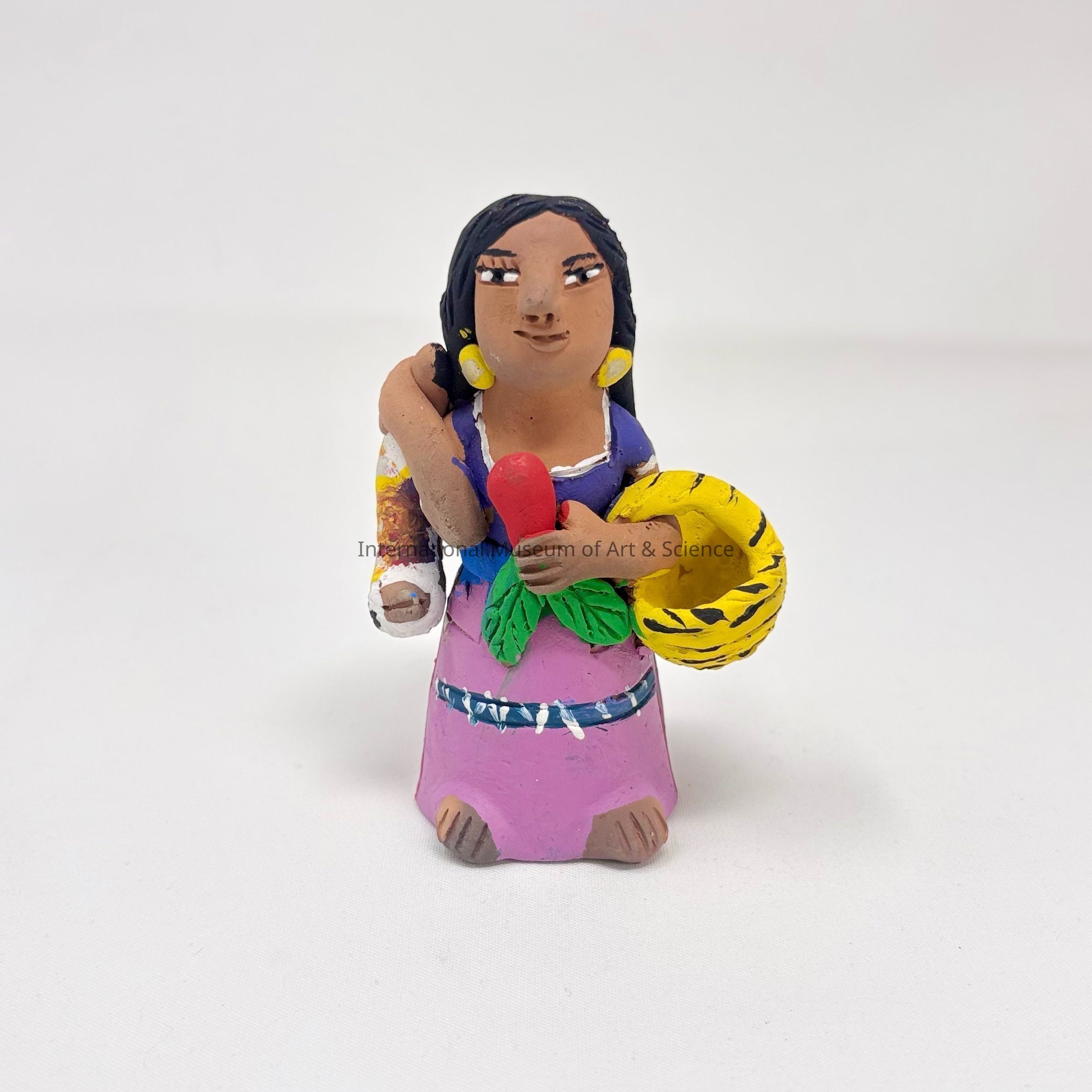 A ceramic figurine of a woman wearing purple blouse, a lilac skirt, and a multi-colored belt. She is holding a basket over her left arm, with a radish in her left hand. She has a turkey over her right shoulder. She is part of a Market Women Scene.Dimensions