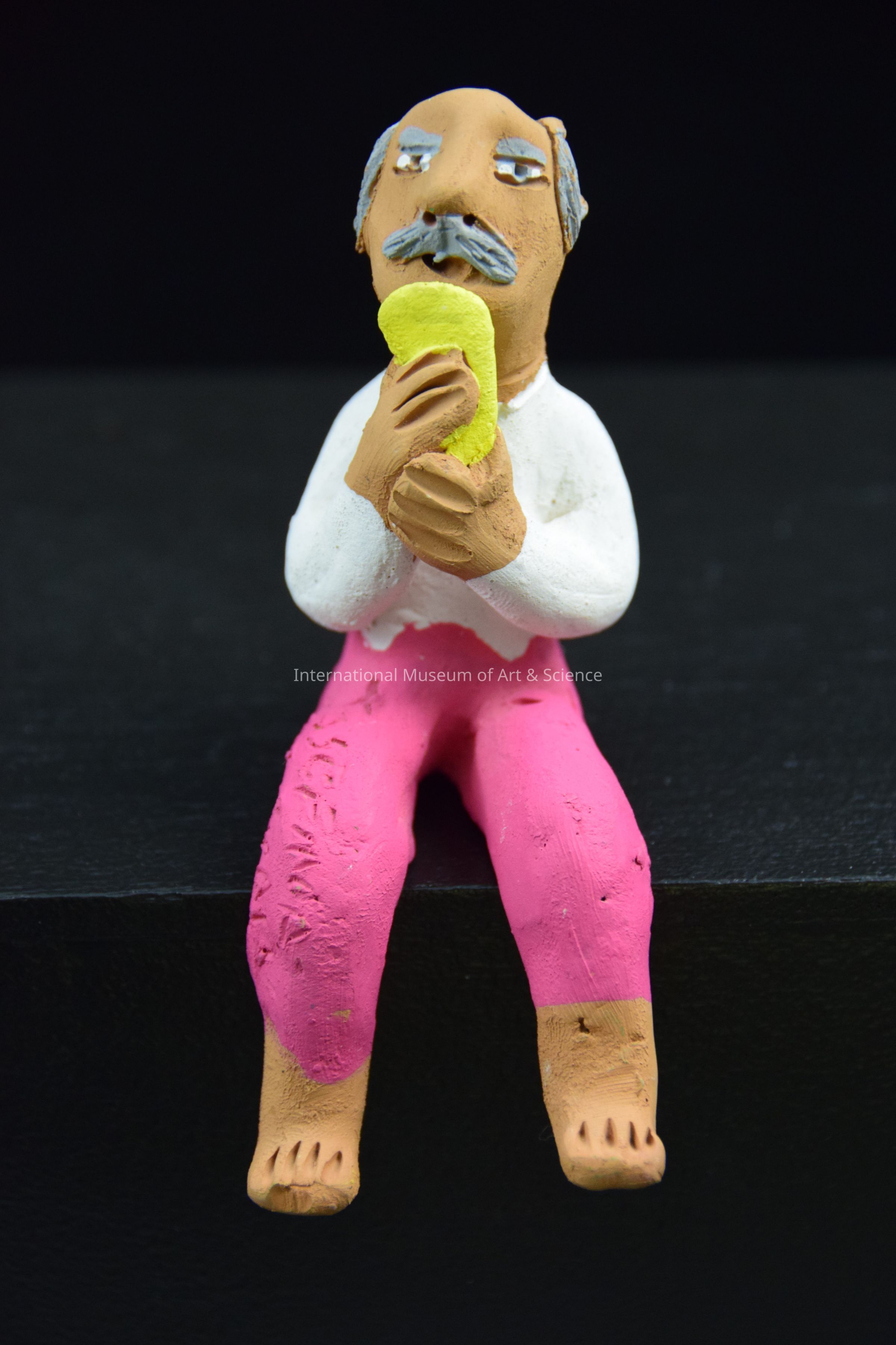A ceramic figurine of a man in a sitting position. He is wearing a white shirt and dark pink pants. He is holding a piece of food up to his mouth. This is part of a Market Scene where men sit and eat at the table with vendors in the background.