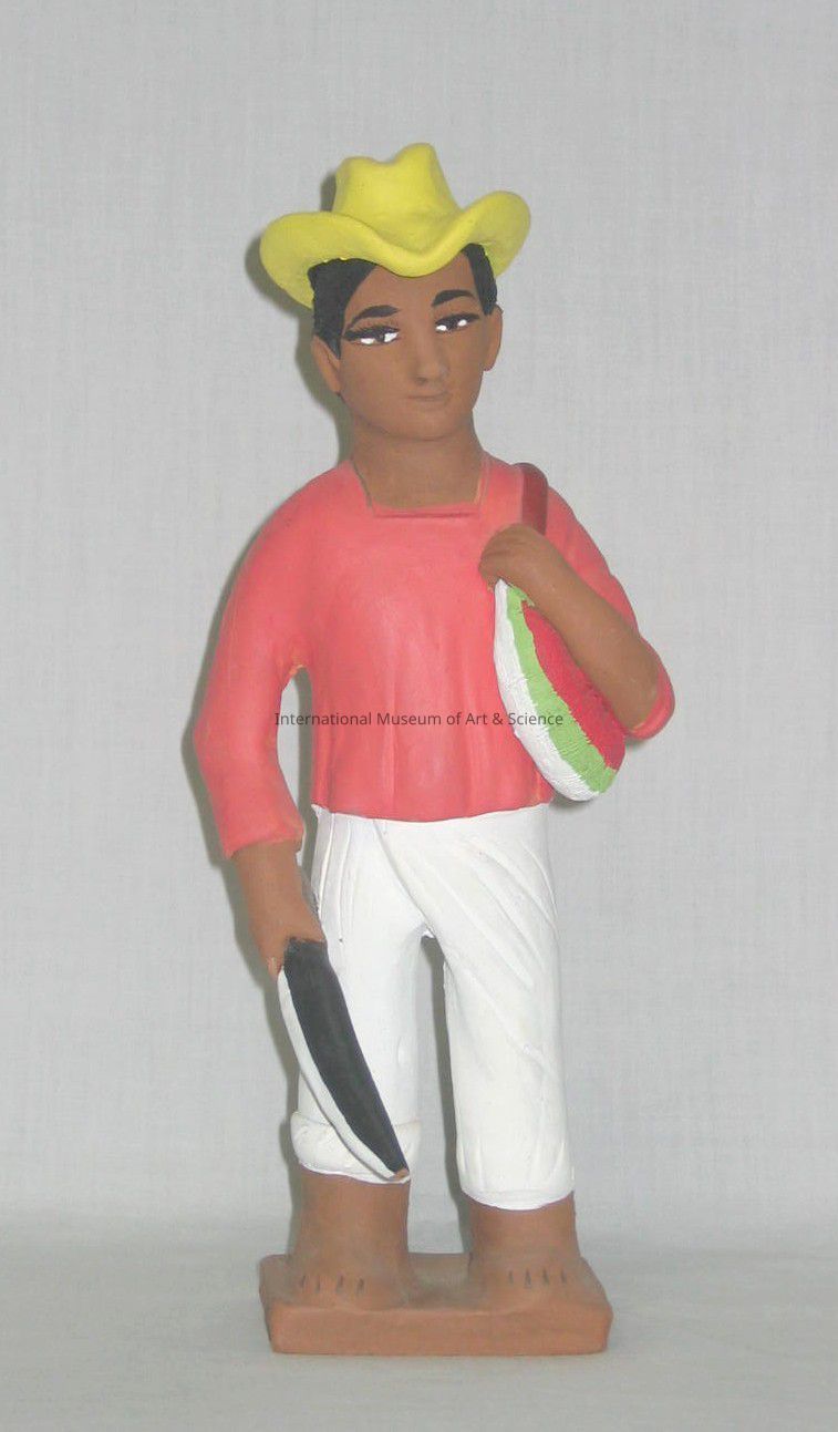 A clay figurine of a man. He is wearing a red shirt, white pants, and a yellow hat. He is holding a knife in his right hand and a bag over his left shoulder.Made/Created